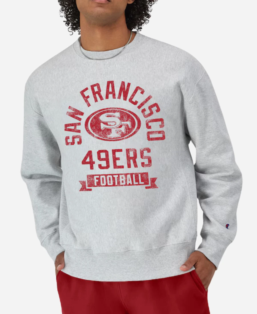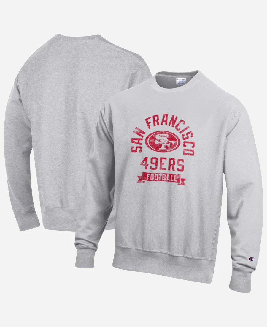 Celebrate every touchdown, every comeback, and every season with the 49ers Champion Reverse Weave Sweatshirt. Jacket Era is here with this alluring heather grey sweatshirt that helps you rep the legacy. It is an amazing blend of timeless style and iconic team spirit—built for true fans of the Faithful. Moreover, it is an ideal investment for a real fan of the American football team, the San Francisco 49ers. This immaculate creation comes from the collaboration between the sportswear fashion brand Champion and the NFL team, the Niners. Thus, to stay warm and loyal, slide into this compelling sweatshirt right now!
