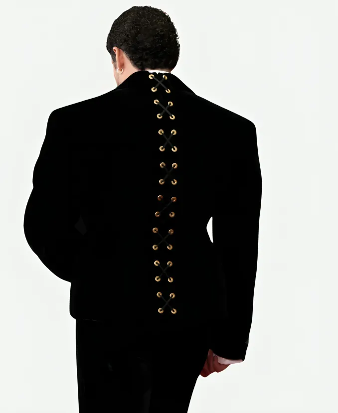 Full of modern attitude, this captivating Grammy Awards 2026 Bad Bunny Suit is a must-have. It is a must-have, as it blends contemporary elegance with premium comfort in one famous black suit. Moreover, the skillful craftsmen of the Jacket Era craft this exquisite black suit from premium velvet fabric in different sizes. The jacket of this suit offers long sleeves, a butter-soft inner, and a stylish lapel collar for a classy touch. The buttoned front makes it easy to wear over your favorite crisp shirt. However, the pants of this immaculate black suit come in full length and provide you with a zipper and buttoned front. To enhance its aesthetic glam, the jacket of this suit offers eye-catching laced-up corset detailing on the back. Thus, make it yours and wear it stylishly to become the center of attraction without trying hard.