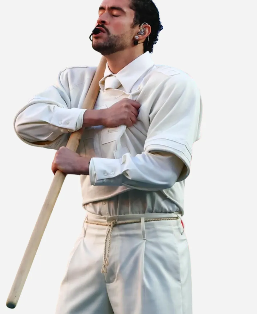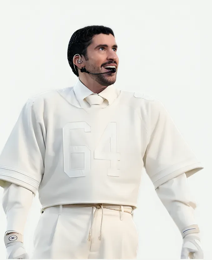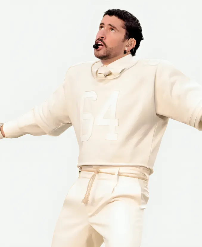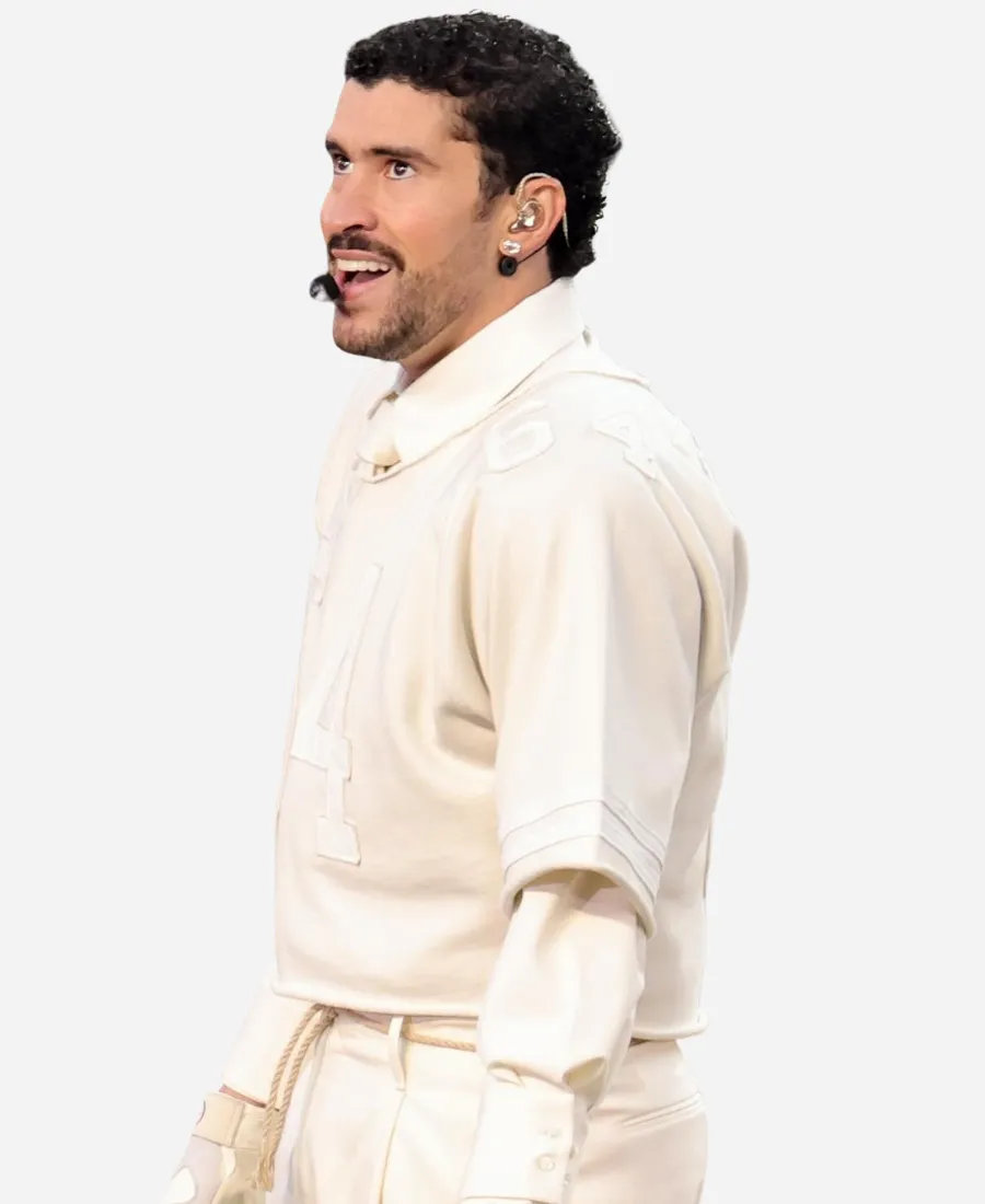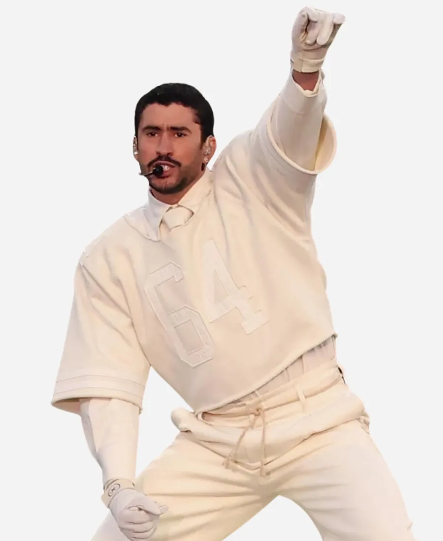 Flow with bright white color by donning the trendy Bad Bunny Super Bowl 2026 Halftime Show Jersey. For the fans of Bad Bunny, the well-known Puerto Rican rapper and singer. Your favorite Jacket Era is here with this alluring white jersey. Not an ordinary piece of clothing that keeps you comfortable. But this jersey is what elevates your outlook with sophistication and the true vibes of the Super Bowl LX Halftime Show. Furthermore, our favorite Bad Bunny wears this classy white jersey while performing during the Super Bowl 60 Halftime Show on February 8, 2026. Wearing this jersey, Bad Bunny steals the attention of numerous eyes with his handsome persona, showcasing his love for football. On the other hand, he provides his fans with a new, standout chic piece to style with 2026 Super Bowl LX flair. So, grab this jersey now and be the showstopper just like Bad Bunny.