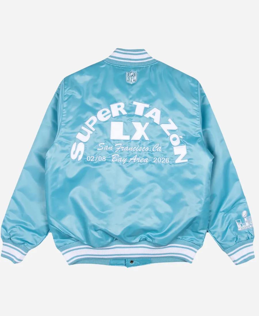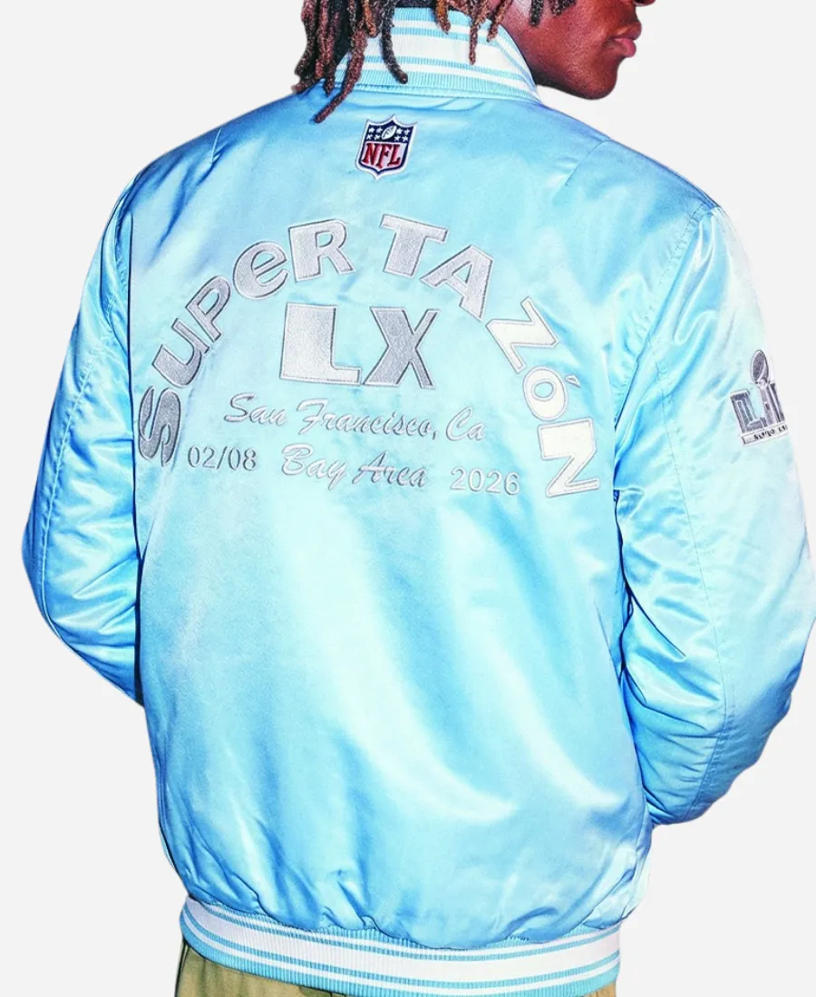 Available in light blue and black, this Bad Bunny x NFL Super Tazón Starter Jacket is a must-have. It is a must, as it instantly elevates your charming persona with the contemporary appeal of the 2026 Super Bowl. Furthermore, the professionals of our fashion house tailor this starter jacket with top-notch stitching from top-notch satin fabric. It comes with a snap-tab front to make it easy to layer over any of your favorite outfits. The long sleeves make it look complete, while the butter-soft inner makes it comfortable to wear. However, the stylish, rich ribbed collar, cuffs, and hem of this jacket provide you with a secure, chic fit. To enhance its aesthetic charm, the branding of the NFL, Bad Bunny 2026, and Super Tazón LX plays an important role. Thus, give it a try and be the center of attraction without trying hard, showcasing your affection for Super Tazón.