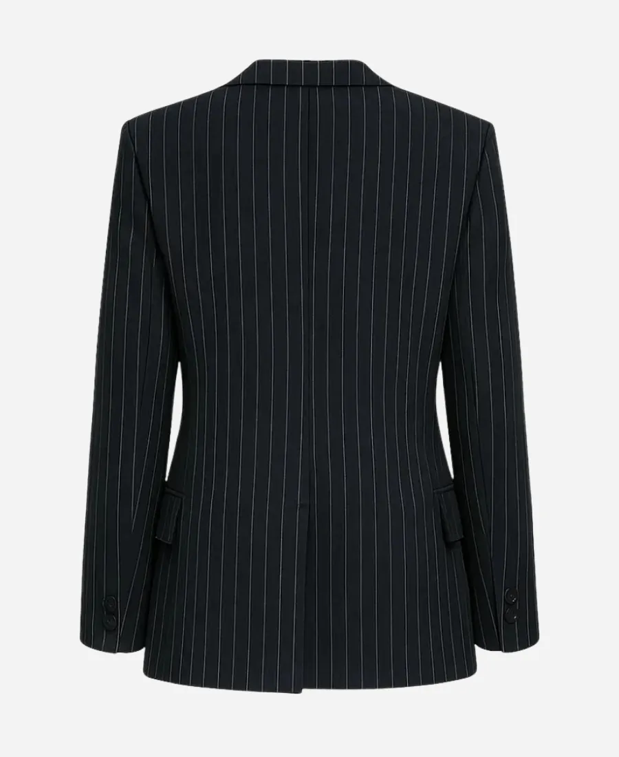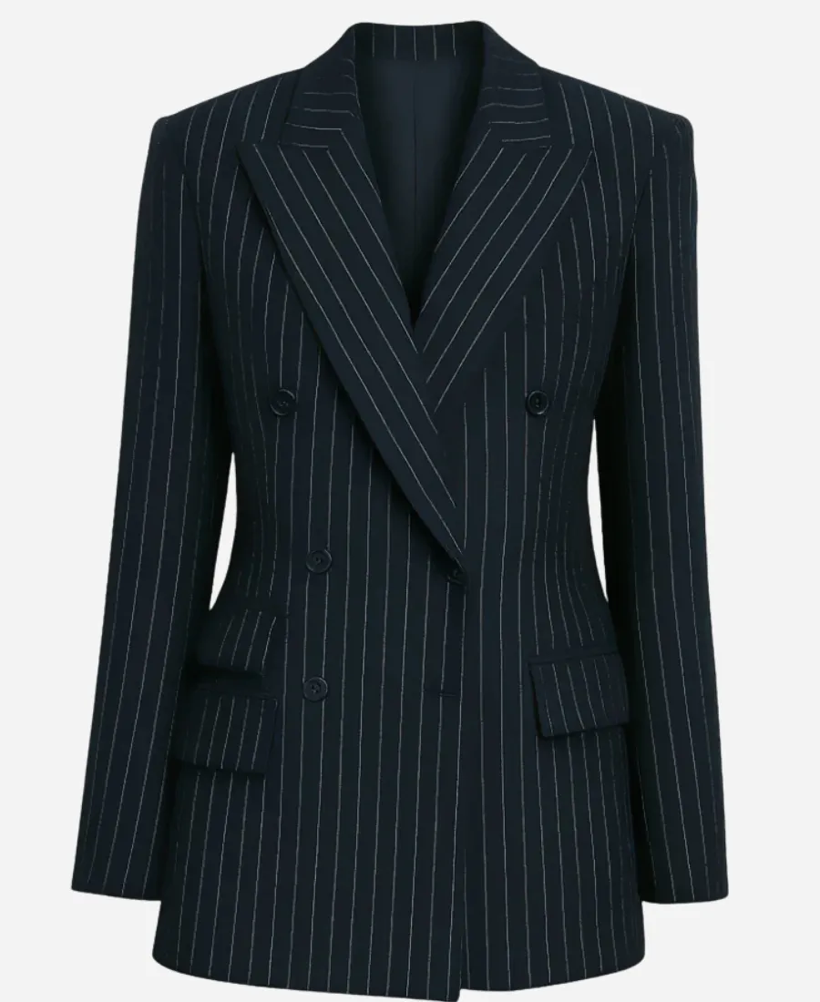 Introducing you to the alluring Champagne Problems Minka Kelly Pinstripe Blazer, a seamless mixture of elegance and modern power dressing. For the fans of the gorgeous and famous American actress, Minka Kelly. The Jacket Era is here with this striking black pinstripe blazer. Not only for the fans of Minka, but this blazer is also an ideal pick for a true fashionista. Furthermore, this trendy black blazer comes from the well-known American romantic comedy film Champagne Problems (2025). The beautiful Minka Kelly wears this sassy pinstripe blazer in this film while performing as the lead character, Sydney Price. On the other hand, if you want to channel the confident fashion energy of Minka Kelly, then this blazer is the best buy. So, make it yours and wear it stylishly to make a powerful style statement without trying hard.