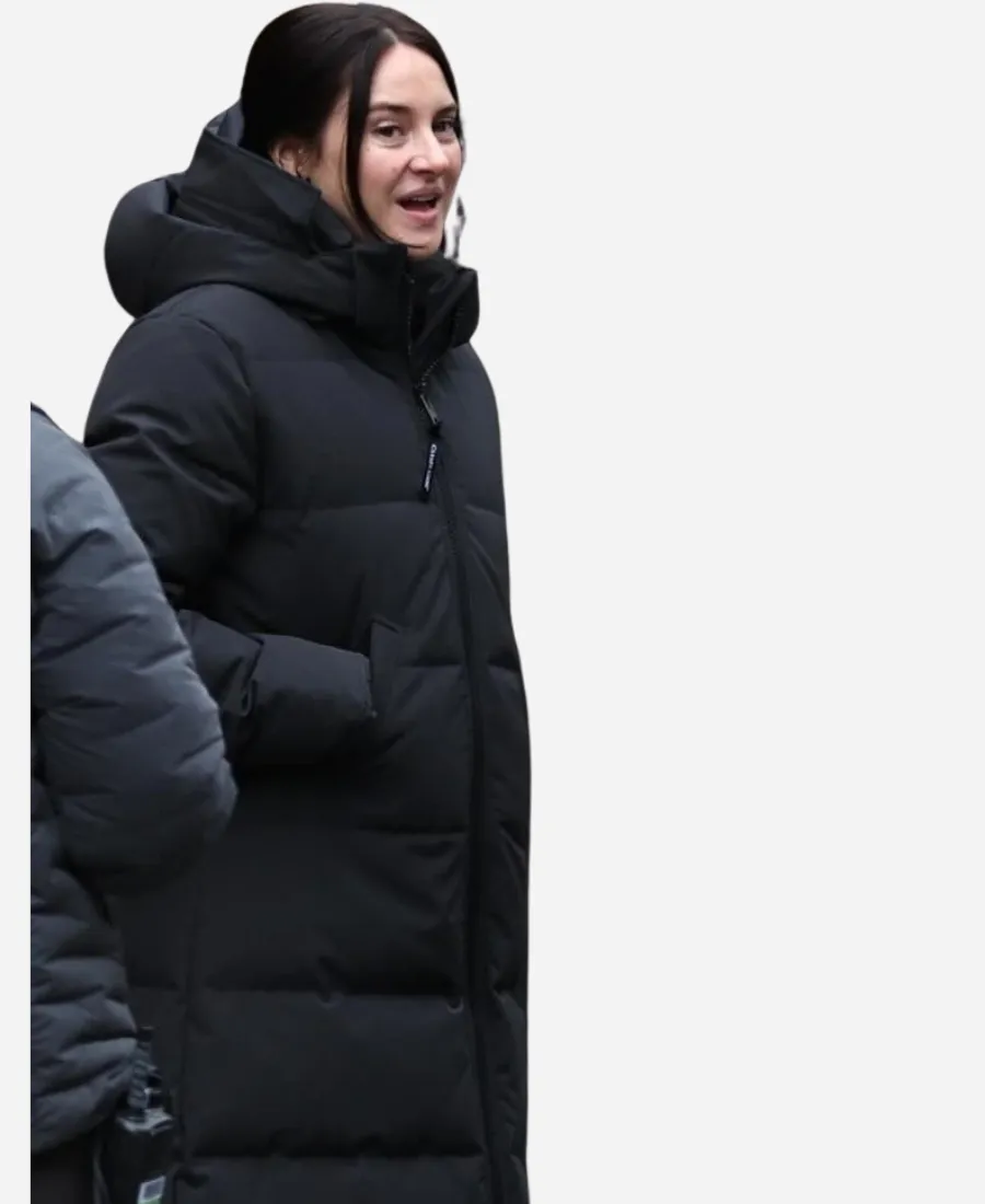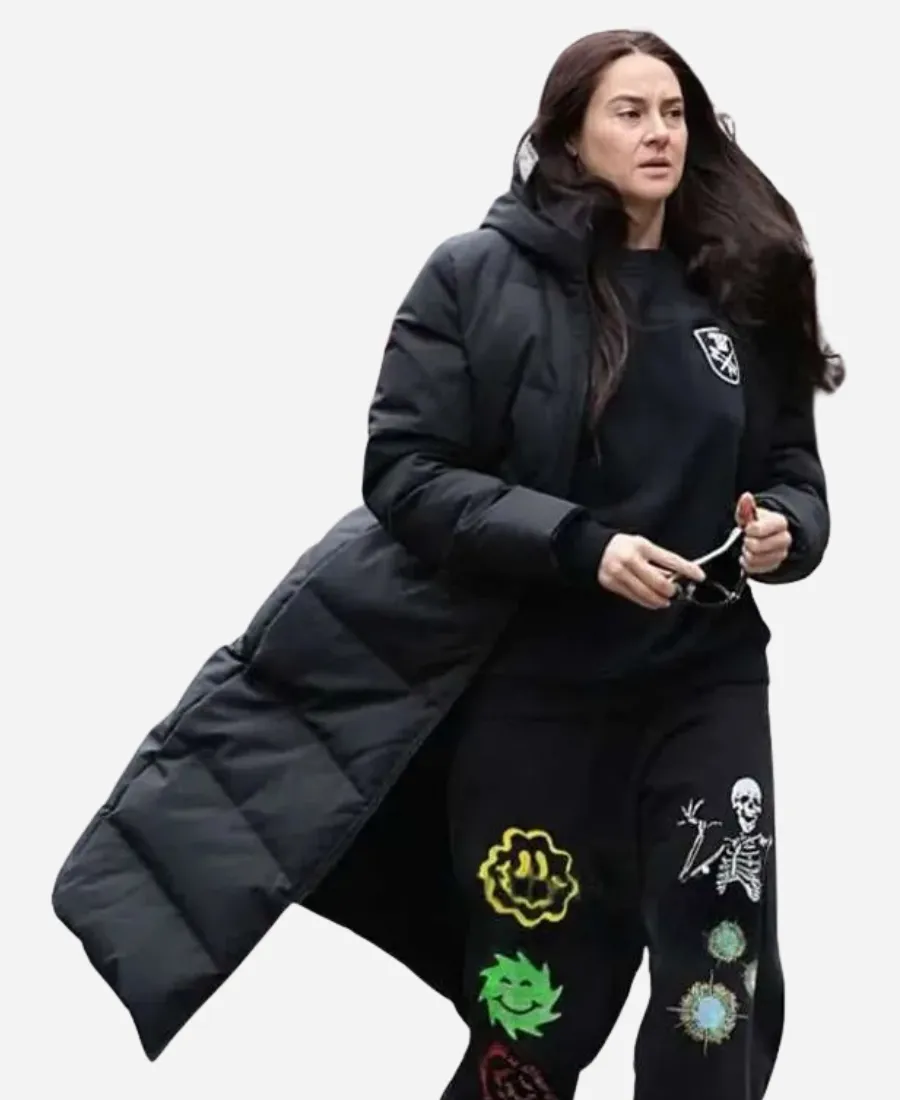 Shailene Woodley Count Me Lies 2026 Sloane Caraway Black Hooded Puffer Coat