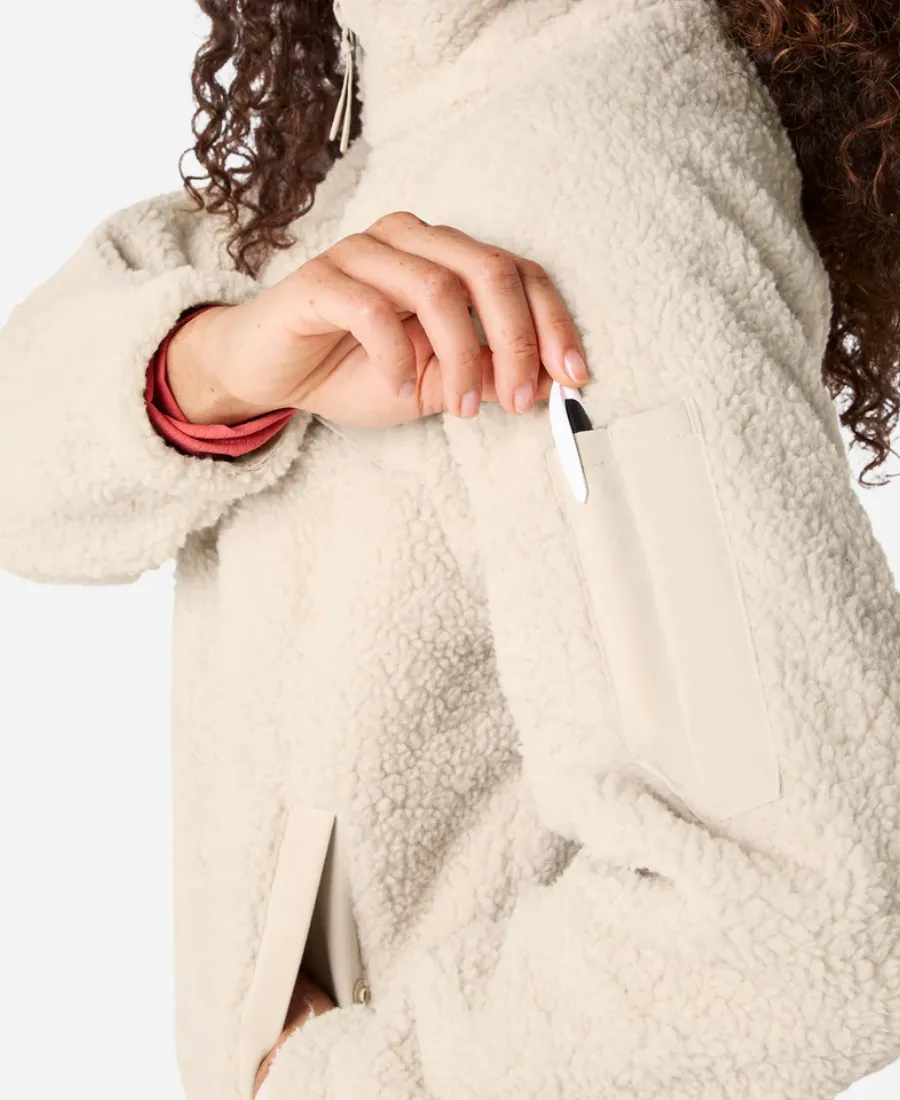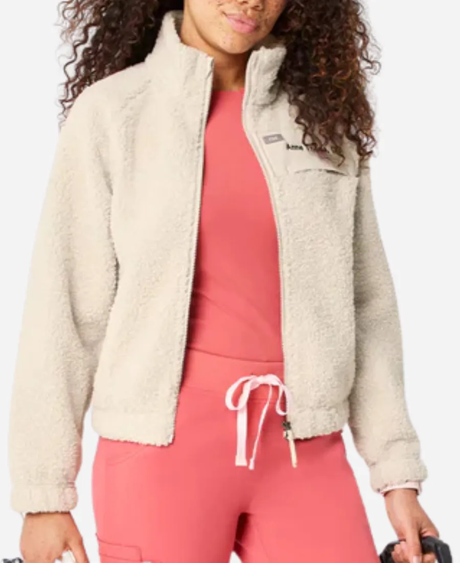 Women’s FIGS On-Shift High Pile Beige Fleece Hooded Bomber Jacket