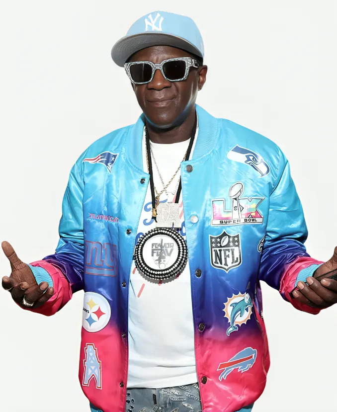 Are you a fan of Flavor Flav, the famous American rapper and TV personality? Want to channel the stylish attitude that Flavor Flav brings to the 2026 NFL Super Bowl? The wait is over, as we are here with this alluring Flavor Flav Super Bowl LX Jacket. A beautiful NFL-themed blue jacket full of contemporary glam, this masterpiece is an ideal investment. Furthermore, it is ideal, as it combines modern-day elegance with never-ending comfort and Super Bowl LX premium flair in one standout piece. Our favorite Flavor Flav wears this tempting blue bomber jacket while attending the major event, Super Bowl LX, on February 8, 2026, at Levi’s Stadium. On the other hand, wearing this jacket, Flavor Flav shows his love and respect for all the NFL teams. So, if you want to look prominent just like him, this blue bomber jacket is the best addition for your charming persona.