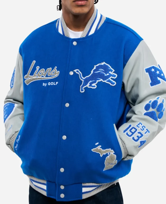 Fans of the Detroit Lions, are you guys ready to boost your sports fashion game with modern streetwear aesthetics? Take a slide into the famous and gorgeous Golf Wang 2025 Detroit Lions Letterman Jacket. A cool, blue-and-grey creation full of modern attitude, this letterman jacket is a must-have for a true fan. Furthermore, it comes from the well-known American streetwear brand GOLF WANG by musician Tyler, the Creator, for the Lions. On the other hand, it’s what combines American football culture with modern-day elegance in one iconic piece. This alluring blue-and-grey masterpiece not only elevates your look but also makes you score engaging compliments. So, grab this now and make your entrance remarkable, bringing the heat of the Lions with GOLF WANG flair to your essence.