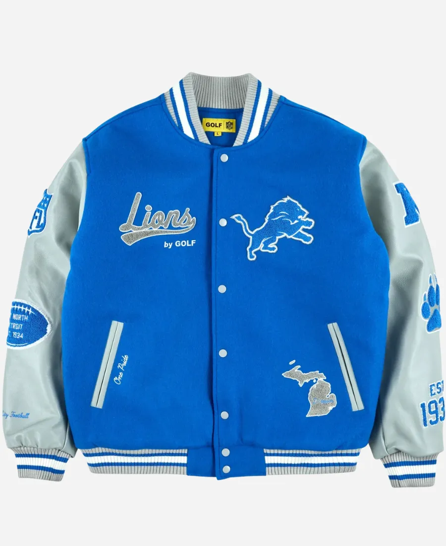 Out for a match or just strolling downtown? This tempting varsity letterman jacket is what makes you a showstopper everywhere. Moreover, it is now available in our latest collection as an excellent imitation in different sizes. This fascinating Golf Wang Detroit Lions 2025 Letterman Jacket is now available in premium wool fabric. To make it look premium and cool, this letterman jacket offers long grey leather sleeves. It comes with striped, rich ribbed cuffs, collar, and hem for a stylish, clean look, providing you with a chic fit. However, the front snap-tab closure makes it easy to wear over anything, especially your favorite inner. The high-quality branding of the Detroit Lions and Golf, including patches, makes it look more attractive. Thus, make it yours to add more spice to your sporty outlook without trying hard.
