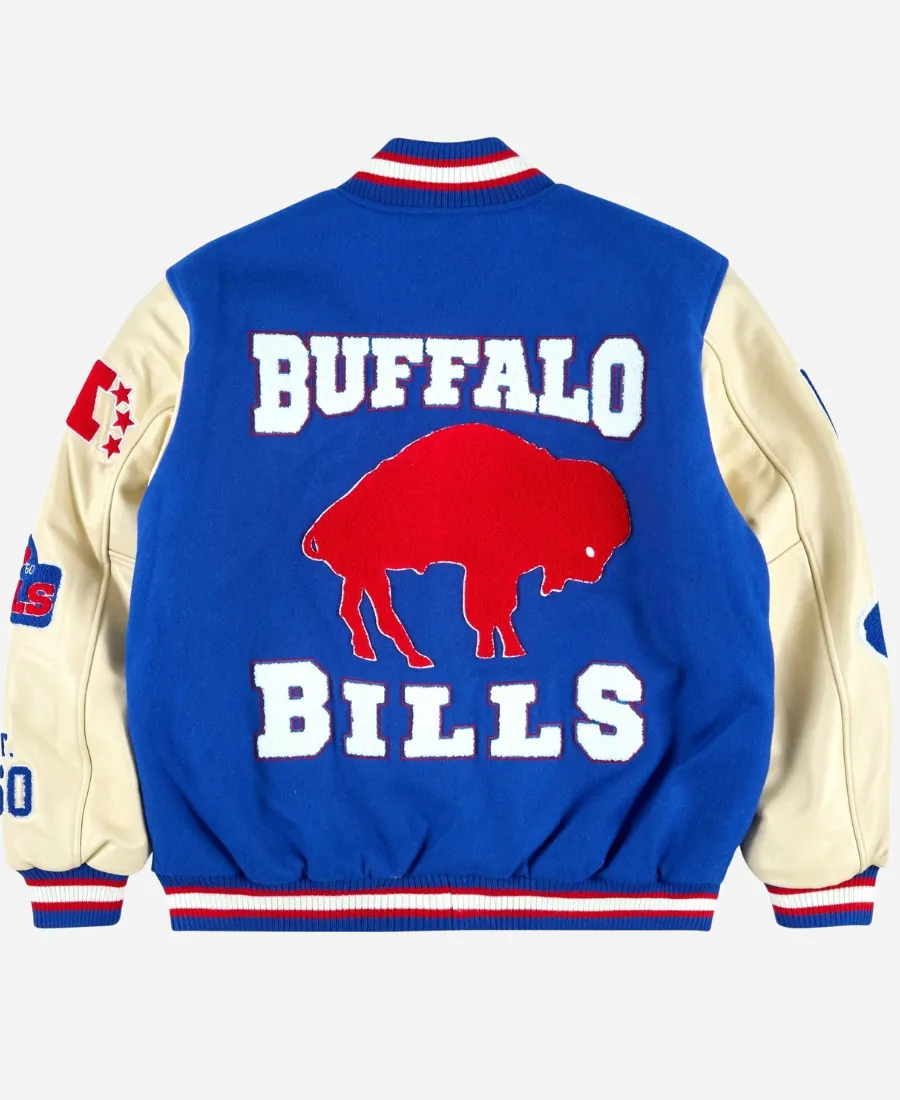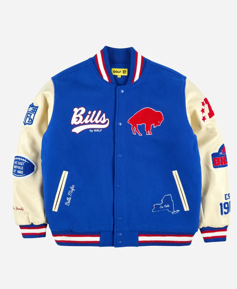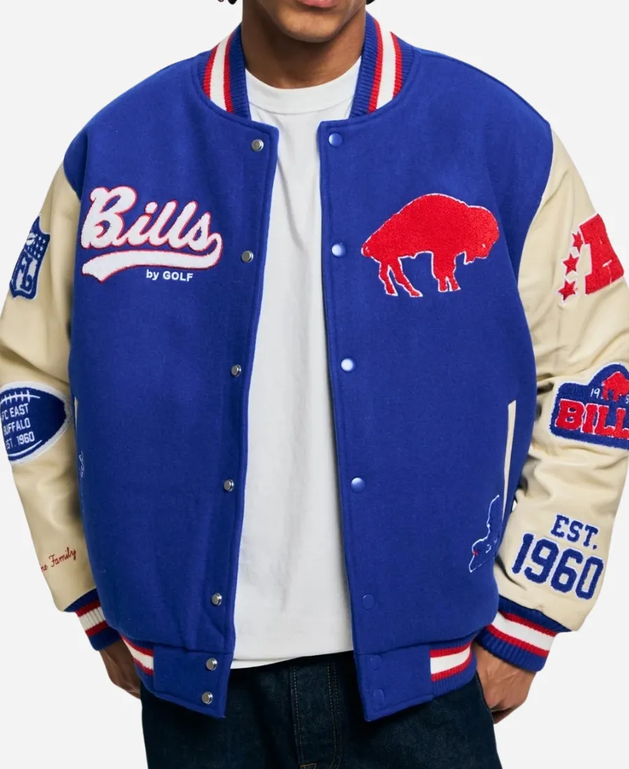 For those who love to stylishly rep the NFL’s famous team, the Buffalo Bills, Jacket Era is here with a trendy varsity jacket. Do you want to look handsome while showcasing your affection for the Bills? Take a slide into the gorgeous and famous Golf Wang Bills Jacket. A fascinating masterpiece full of modern attitude, this royal blue and cream letterman jacket is not an ordinary jacket. But it is what makes you set a new style statement with team pride and contemporary style. Moreover, this charming and sporty letterman jacket comes from the famous American streetwear brand Golf Wang, by rapper and designer Tyler, the Creator, for the Bills. On the other hand, this tempting outerwear is now available at Jacket Era as an excellent imitation. So, grab it now and make your outlook speak volumes for the Buffalo Bills in Golf Wang premium style.