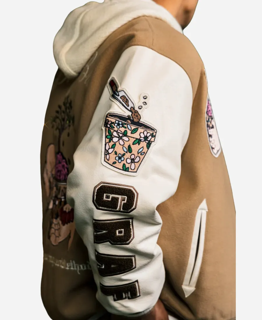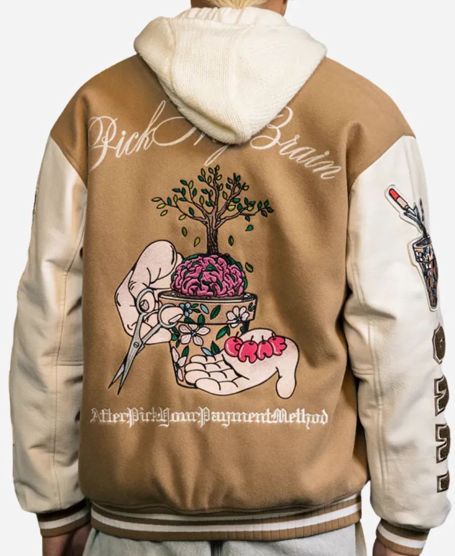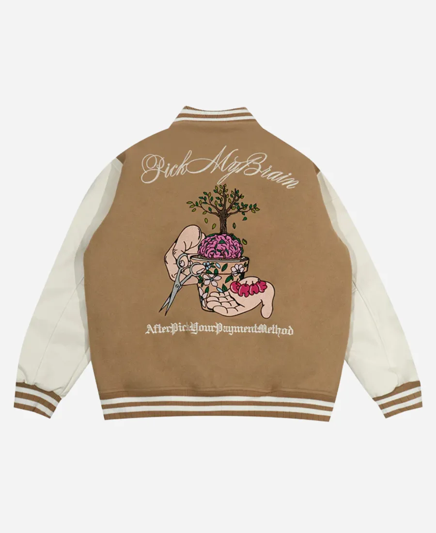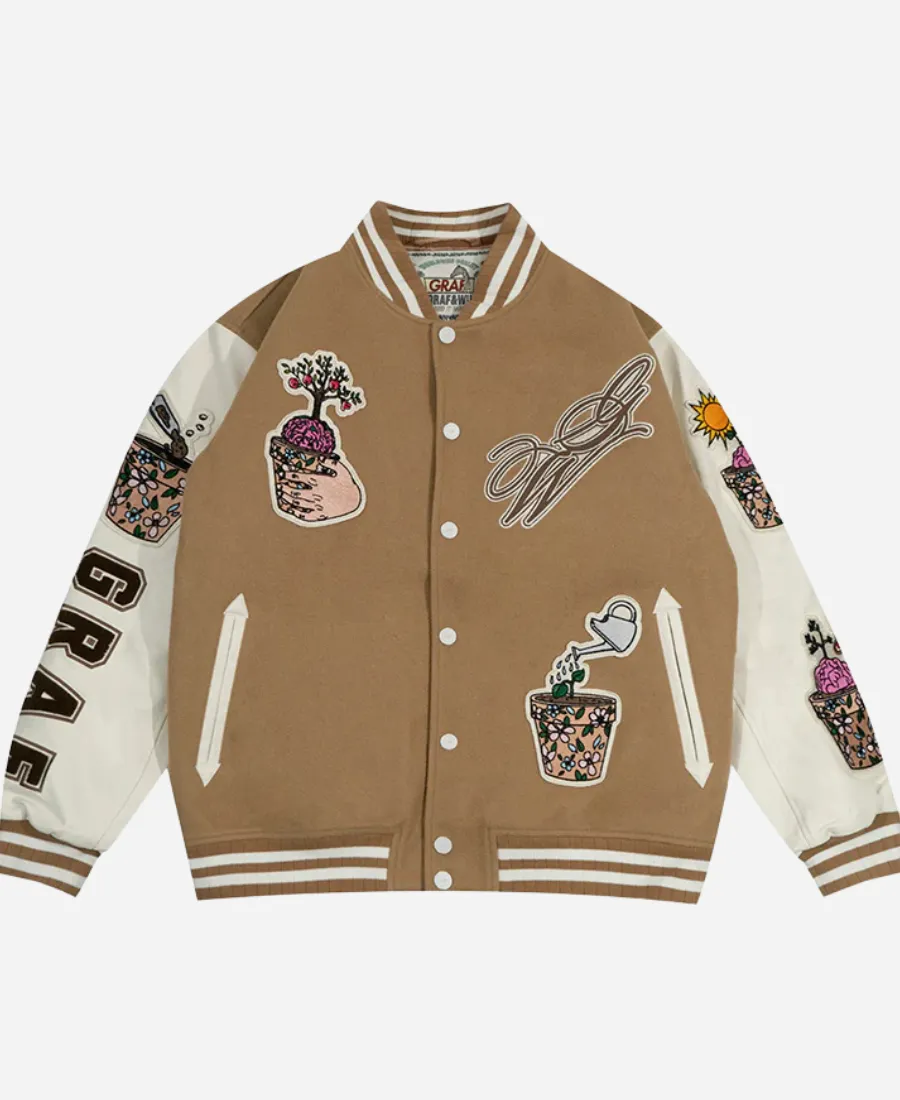 GRAF&WU Brainpower Potted Plant Brown Leather Sleeves Baseball Jacket