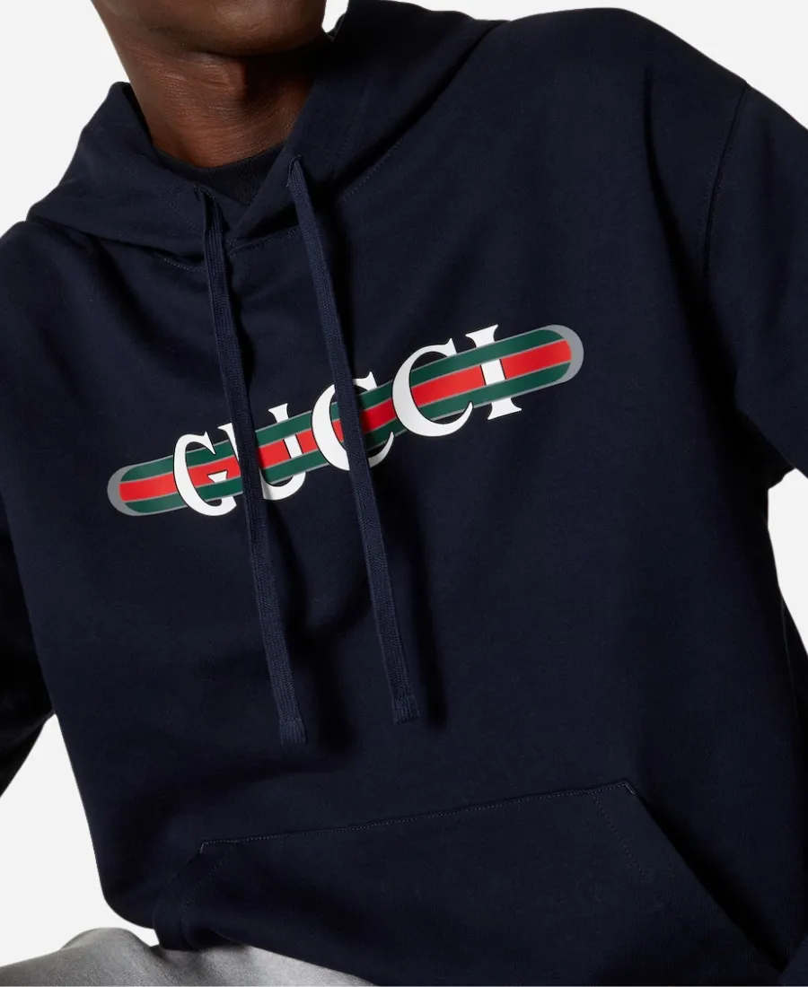 Gucci Logo Print Cotton Jersey Blue Pullover Hoodie