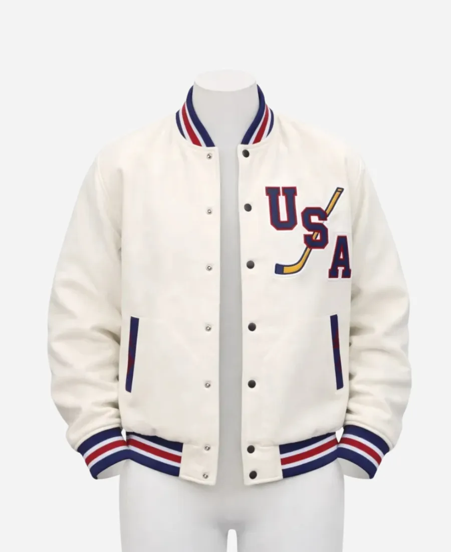 Step into iconic ice hockey style by wearing the tempting John Wroblewski Hockey Team USA Jacket. A perfect addition to elevate your outerwear with a vintage piece that captures the heart and hustle of American ice hockey. Moreover, this beautiful white varsity jacket is now available in our latest collection in premium wool fabric. It comes with long sleeves for a complete look and a butter-soft inner for endless comfort. The high-quality snap-tab front makes this varsity easy to layer over any outfit. However, to provide you with the chic fit and clean look, it comes with a rich ribbed collar, cuffs, and hem. To enhance its aesthetic charm, this white jacket features red & blue accents and the design of USA lettering with hockey stick embroidery. Thus, grab this jacket now to show you’re all in for Team USA.
