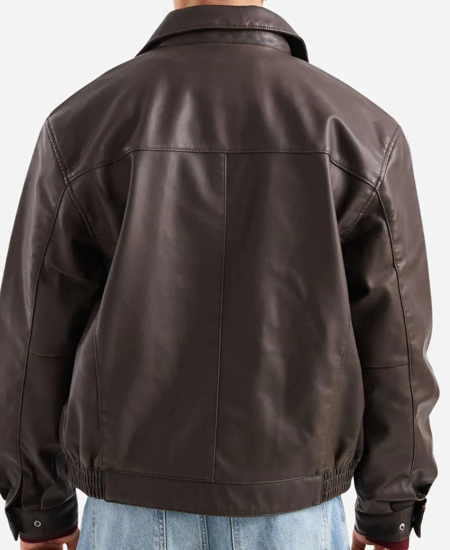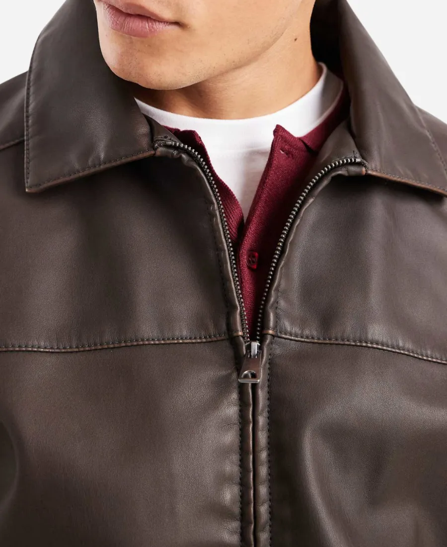 Men’s Brown Bomber Leather Jacket with Rib Collar