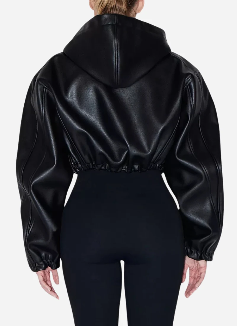 Purchase this Kylie Jenner KHY Cropped Black Hooded Leather Jacket now from here at an impressive sale price!