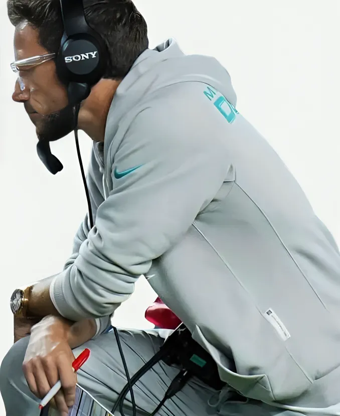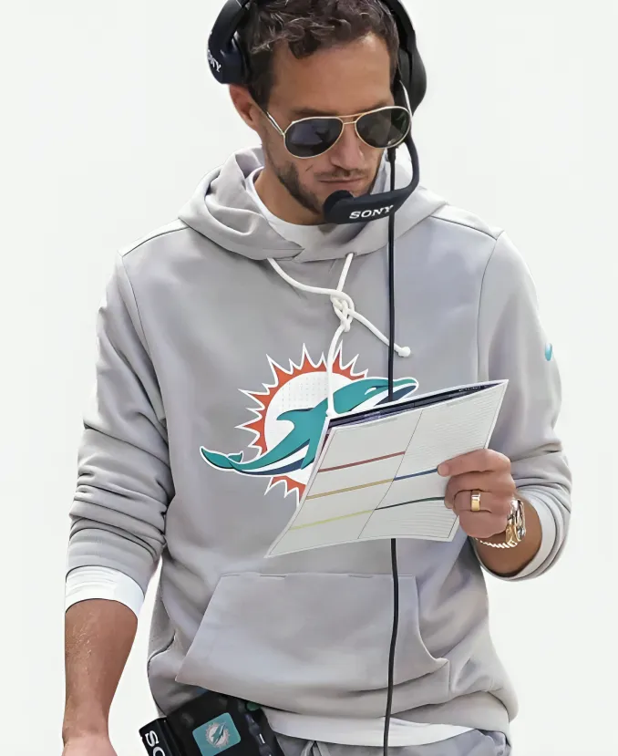 Are you ready to gear up like the pros and to show off your Miami spirit in style with confidence? Are you a die-hard fan of Mike McDaniel and want to stylishly channel his athletic and leadership vibes? Take a slide into the famous Mike McDaniel Miami Dolphins Hoodie. A sleek creation that helps you step onto the sidelines in true Dolphins style. Furthermore, it is a collaborative creation and is now available as an imitation in Jacket Era’s new collection. Mike McDaniel, who is the head coach of the Miami Dolphins, wears this collaborative grey hoodie. On the other hand, it is a result of the collaboration between Nike and the NFL team, the Miami Dolphins. Wearing this will help you bring the Dolphins’ energy wherever you go, just like Mike McDaniel. So, make it yours to rep your team and your favorite coach with style and pride.