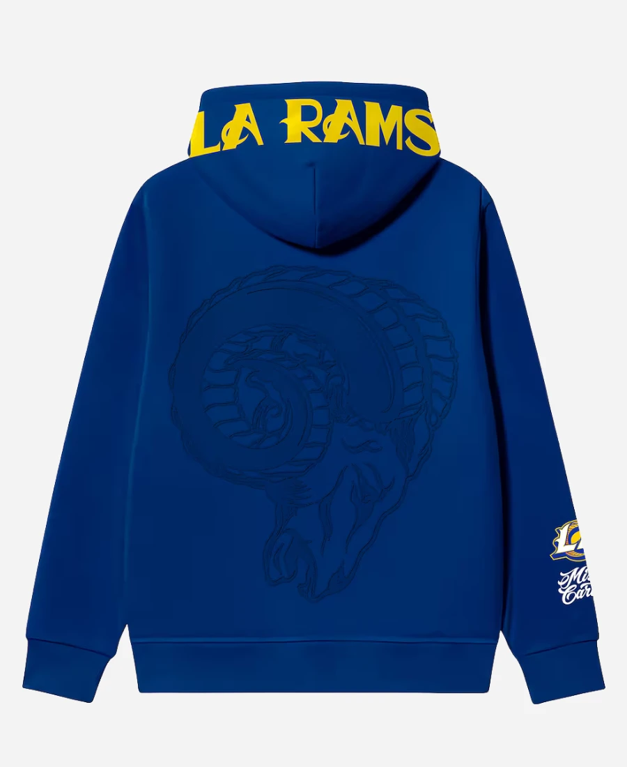 Bold. Authentic. Unmistakably LA. The Mister Cartoon x LA Rams Graphic Hoodie is more than merch—it’s a wearable masterpiece. Jacket Era is here with this intriguing hoodie that combines street art immaculately with the gridiron greatness. It brings iconic LA culture straight to your wardrobe without trying too hard. Furthermore, this gorgeous hoodie is the result of an amazing collaboration between legendary tattoo artist Mister Cartoon and the LA Rams. To showcase your love for your favorite American football team, the Los Angeles Rams, this royal blue hoodie is the best investment. On the other hand, this iconic collab fuses street-style roots with team pride like never before. So, are you ready to step into the culture with this exclusive graphic hoodie?