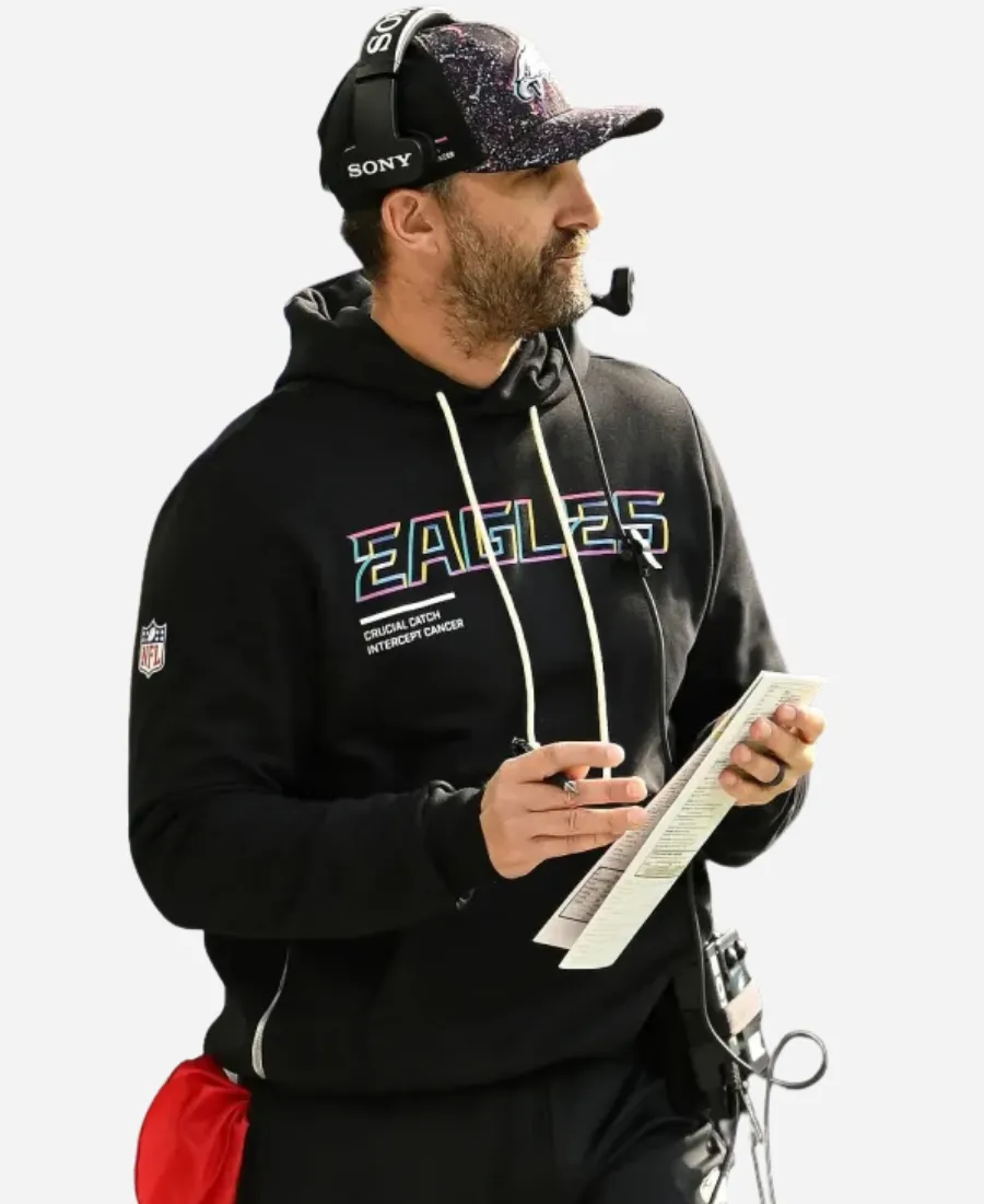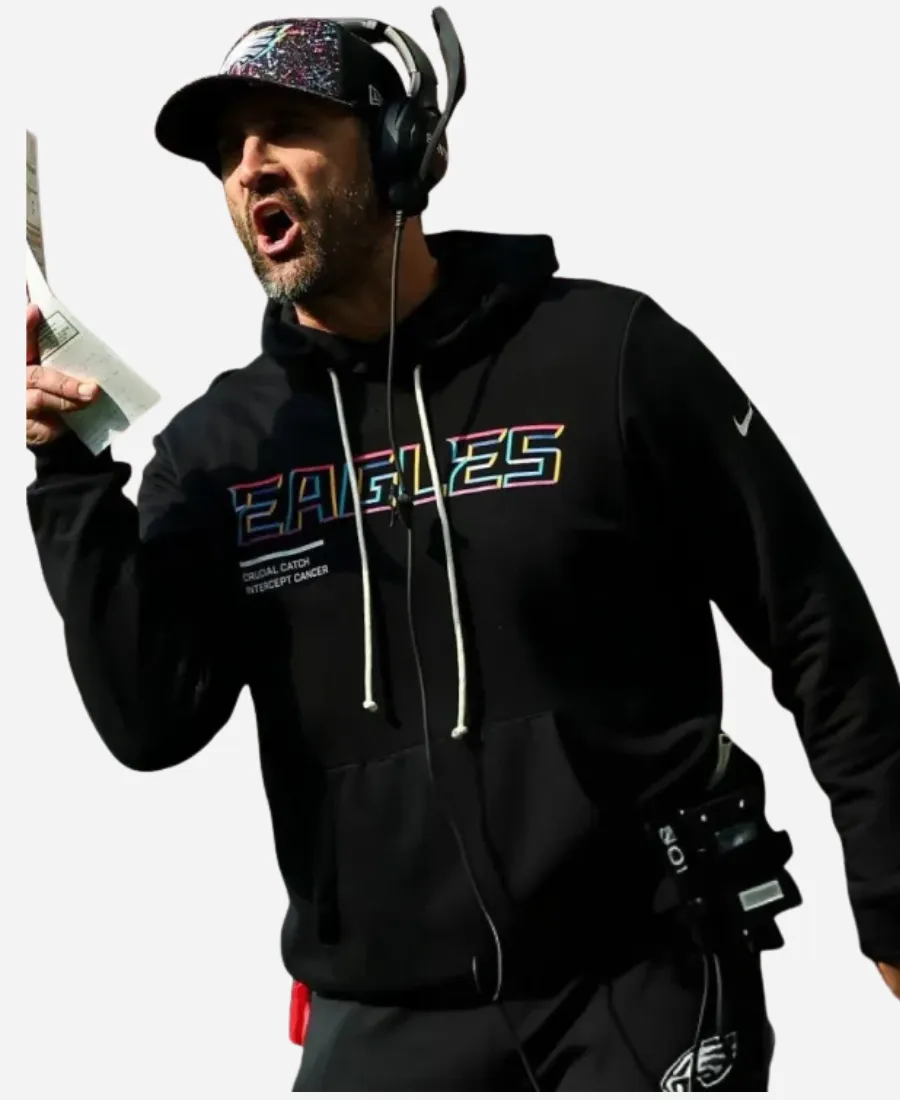 From the sidelines to the stands, this Crucial Catch Eagles Hoodie will make you grab attention. The handsome Nick Sirianni wears this classy black hoodie to showcase his support for the cause that really matters. Furthermore, it is now available as an imitation at Jacket Era in pure fleece fabric in different sizes. The multicolor Crucial Catch pattern, classy Eagles fonts, and the logos of Nike and the NFL make it look more tempting. To make it look complete, this hoodie features long sleeves with rich ribbed cuffs and a rich ribbed hem. However, the adjustable and thick hooded collar adds a sleek touch, providing both warmth and style. It is a perfect addition for Eagles fans, cancer awareness supporters, and anyone who loves limited-edition NFL gear. So, make it yours right now!