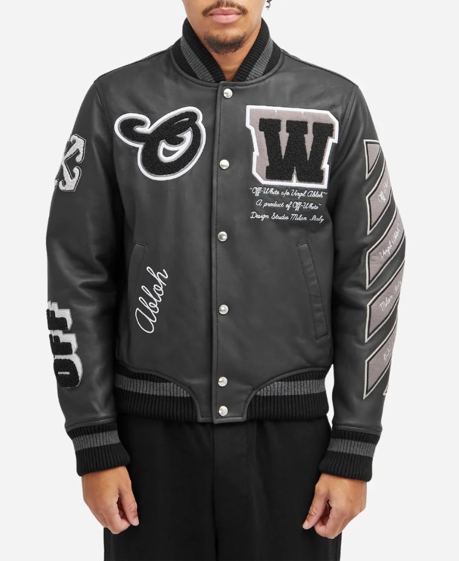 Be the first to review “Off White Black Leather Varsity Jacket” Cancel reply