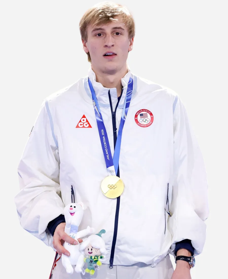 Introducing you to the classy Olympics 2026 Jordan Stolz Jacket, where top-notch craftsmanship meets Milano Cortina flair. For the fans of Jordan Stolz, the handsome American speed skater who won multiple medals on the ice. The Jacket Era is here with this tempting white outerwear. Moreover, this bright white jacket is a part of the 2026 collection of Nike’s sub-label, premium brand ACG (All Conditions Gear). The participants of the 2026 Olympic Team USA, including Jordan Stolz, wear this trendy white jacket at the 2026 Winter Olympic Games. Wearing this white jacket, Jordan Stolz, who set records and captured the hearts of fans around the world, makes a bold style statement. On the other hand, this eye-catching white masterpiece is now available at the Jacket Era as an excellent imitation. So, to bring more charm and comfort to your daily wear, this white jacket is the best pick.