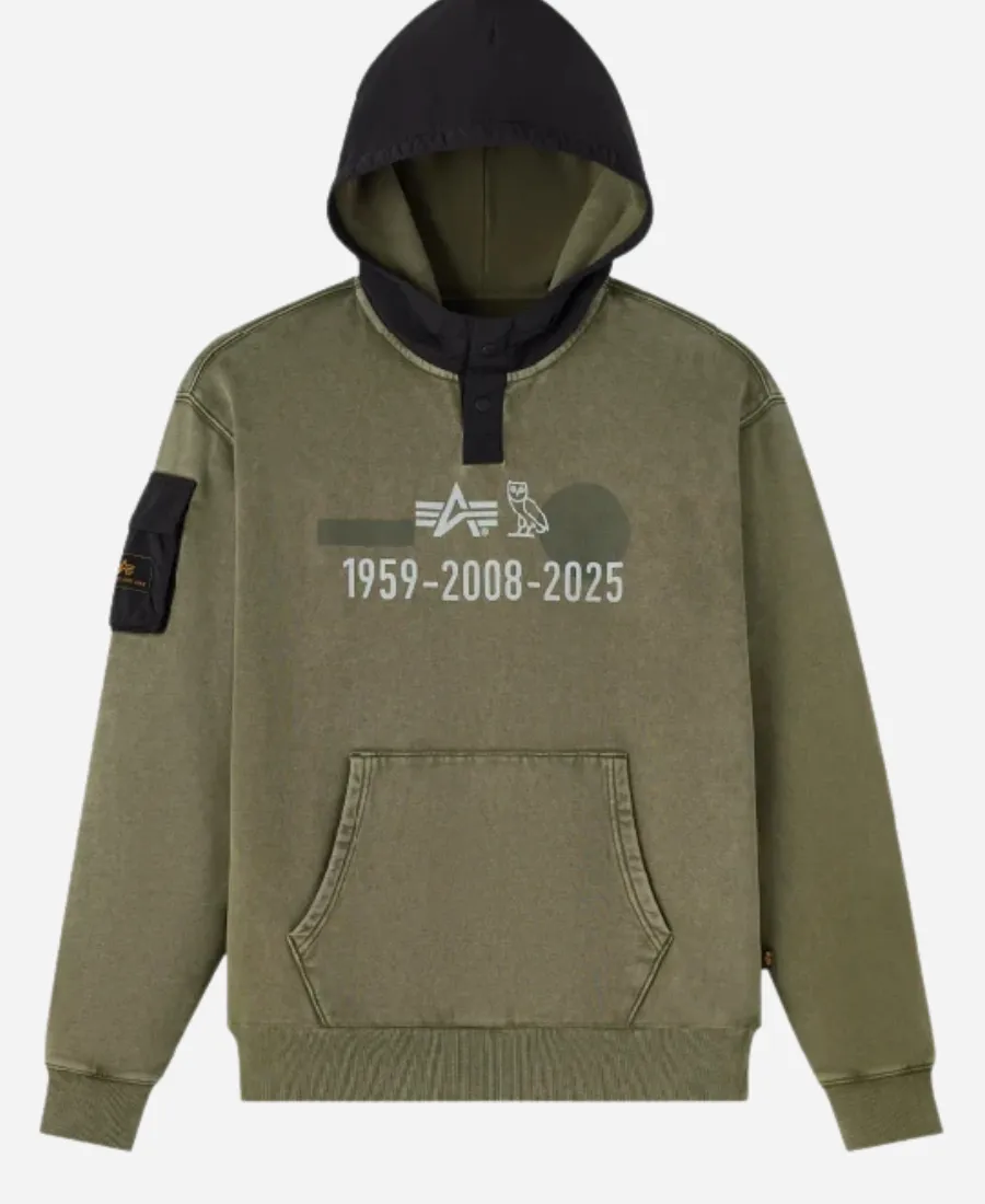 The OVO Alpha Industries Hoodie is now available at Jacket Era as an imitation. This olive green pullover hoodie is available here in our new collection in different sizes. Furthermore, our professionals create this hoodie from top-notch cotton fabric with high-quality stitching. It comes with long sleeves, rich ribbed cuffs, and a rich ribbed hem for a chic fit. The pullover closure makes it easy to wear, while the cozy and stylish hooded collar adds extra comfort. However, the branding of the brands adds appeal and a premium touch. Whether you’re out for a dinner gathering or a casual hangout, this olive green hoodie will make you draw attention. So, grab it right now and show off your passion for fashion comfortably and stylishly.