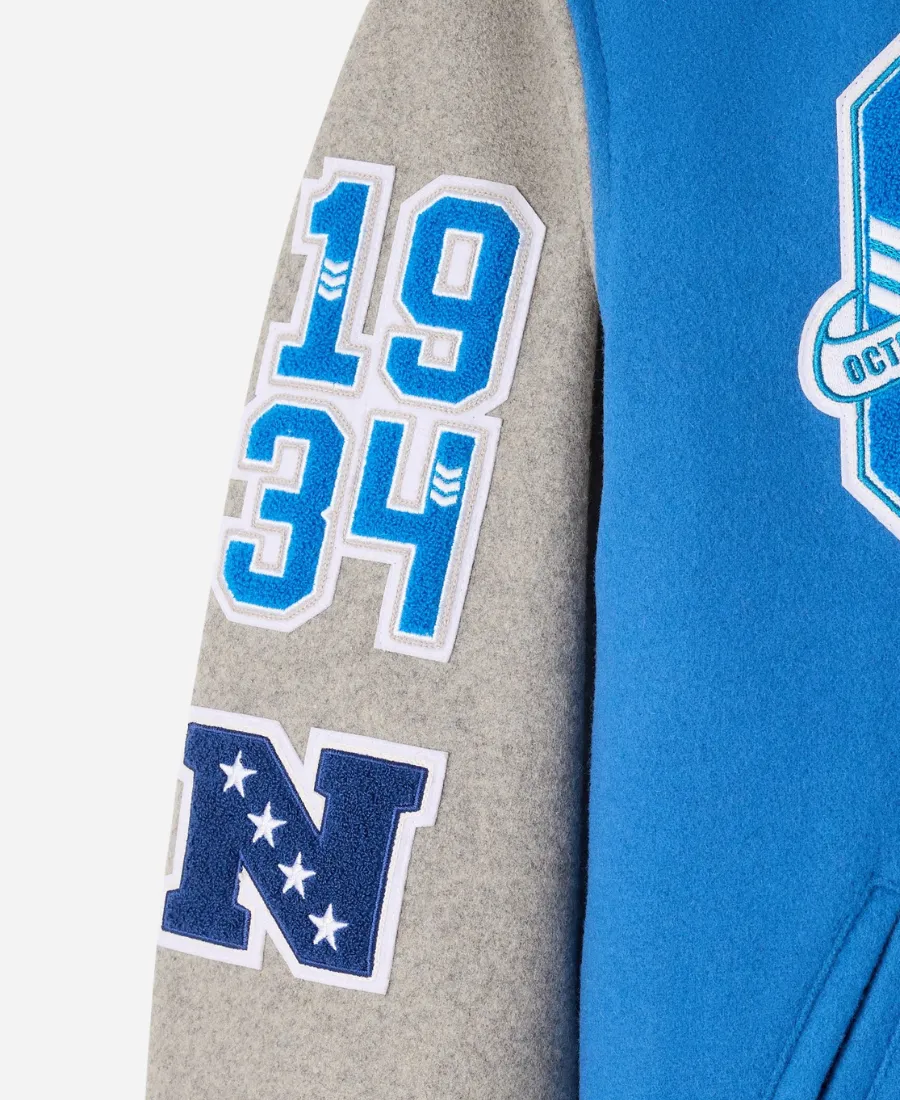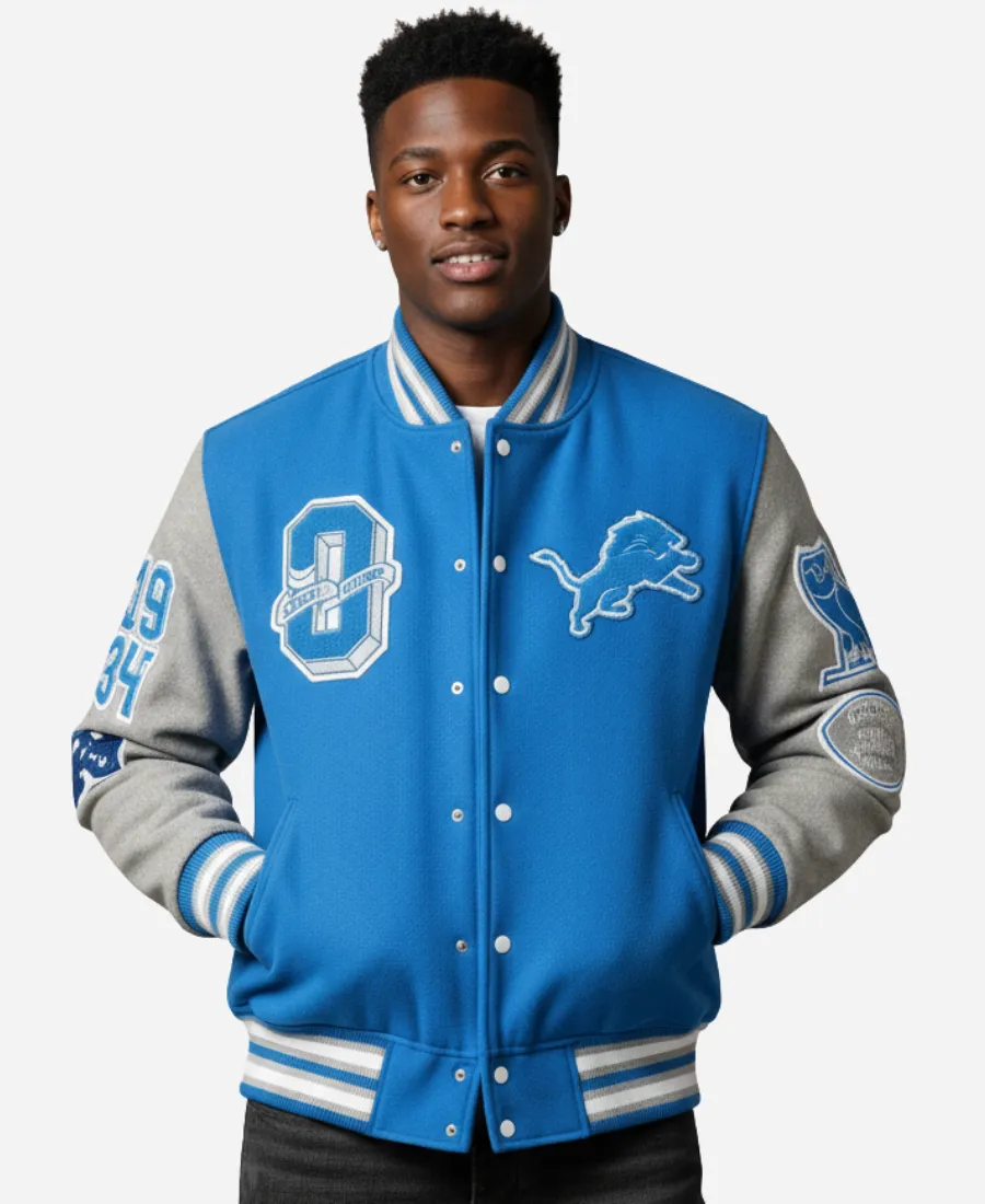 Ready to showcase your affection stylishly for the NFL’s famous team, the Detroit Lions? Take a slide into the gorgeous and famous OVO Detroit Lions Varsity Jacket—where luxury comfort meets high-end fashion. Furthermore, this exquisite blue varsity jacket comes from the 2025 collection of the famous collaboration between the NFL and OVO. This tempting blue collaborative masterpiece is not a normal jacket. But this varsity jacket is what infuses October’s Very Own premiumness with the Lions’ athletic style in one piece. On the other hand, this comfy and stylish blue beauty is now available at Jacket Era as an excellent imitation. It combines American football culture with modern elegance, making it the best investment for Lions fans. Thus, grab this jacket now and steal the spotlight without trying hard with confidence.