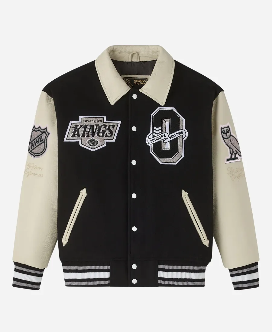 Are you a die-hard fan of the professional ice hockey team, the Los Angeles Kings? For fans and those who dare to look prominent, Jacket Era is here with a gorgeous black varsity jacket. To stylishly wear your team, take a slide into the famous OVO Los Angeles Kings Varsity Jacket. Furthermore, this bold, classic, and royal creation is what brings championship energy to the streets. It is a result of the collaboration between two different worlds, the NHL’s Los Angeles Kings and Drake’s fashion brand OVO. On the other hand, it is now available here in Jacket Era’s new collection as an excellent imitation. This tempting black piece redefines what it means to wear your team’s pride in style. So, try it now to step up your sports fashion game with a jacket fit for royalty.