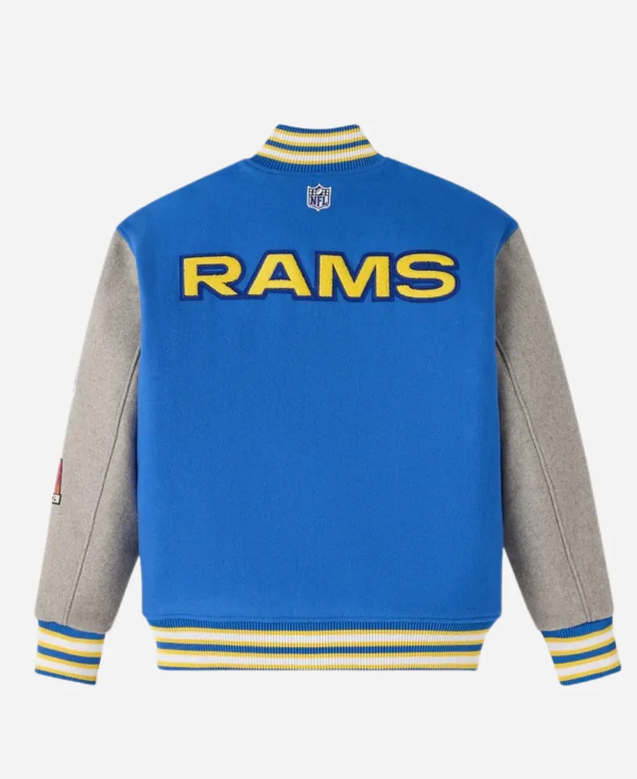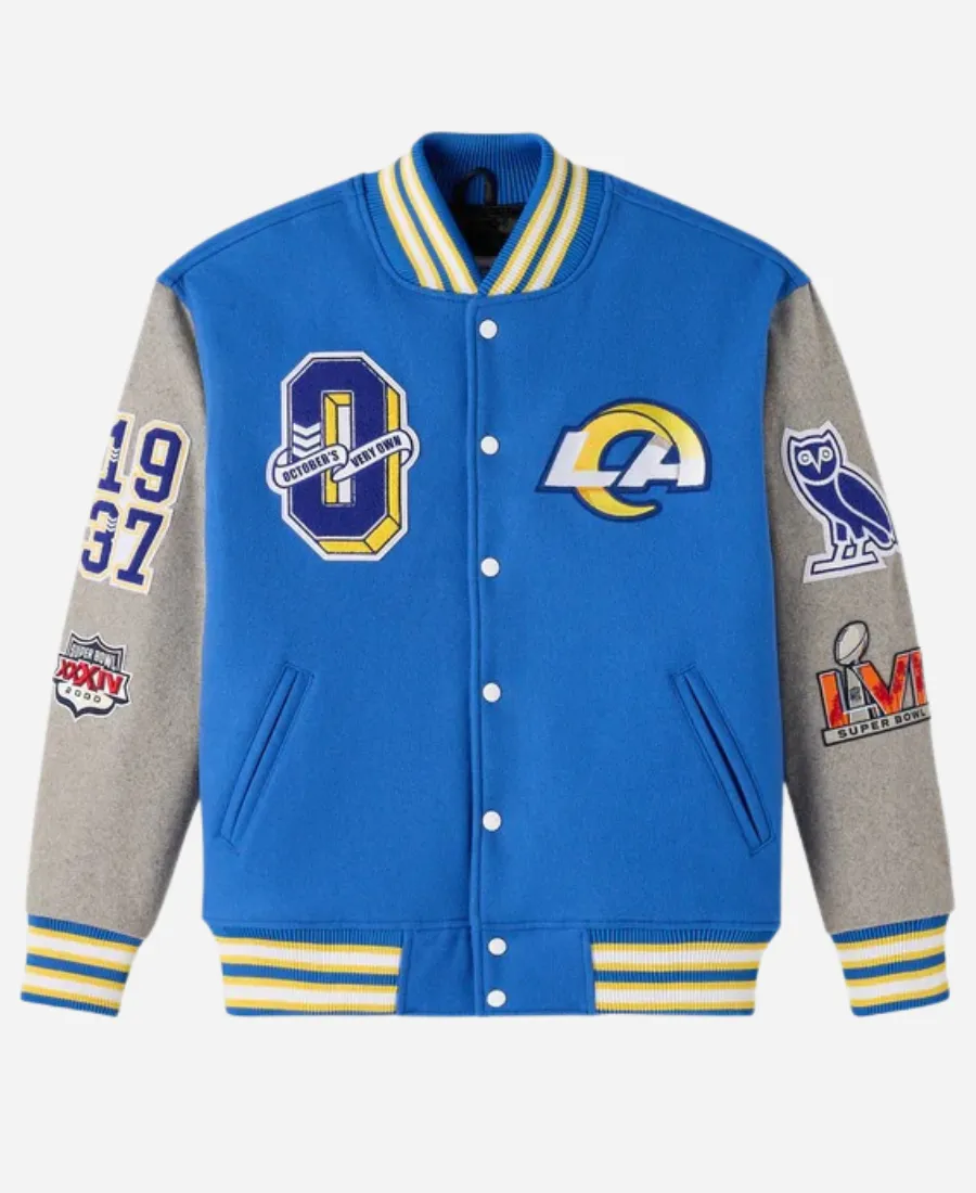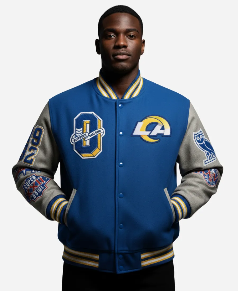 To help you cheer your favorite LA Rams stylishly, the Jacket Era is here with a trendy varsity jacket. Want to stand out while showcasing your love for the NFL’s famous team, the Los Angeles Rams? Then take a slide into the compelling and contemporary OVO Los Angeles Rams Varsity Jacket. Furthermore, this beautiful blue varsity jacket that we bring is an ideal addition for a true Rams fan. It is what comes from the 2025 collection of the collaboration between October’s Very Own and the NFL. This jacket blends American football culture with Canadian fashion brand OVO’s aesthetics in one piece, making it the best investment. On the other hand, this smart and comfy varsity jacket is available at Jacket Era as an excellent imitation. So, grab yours right now and steal the spotlight without wearing anything heavy or flashy.