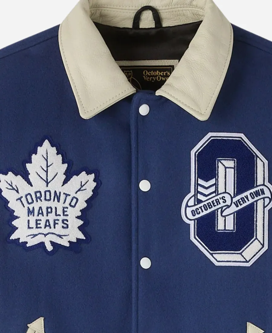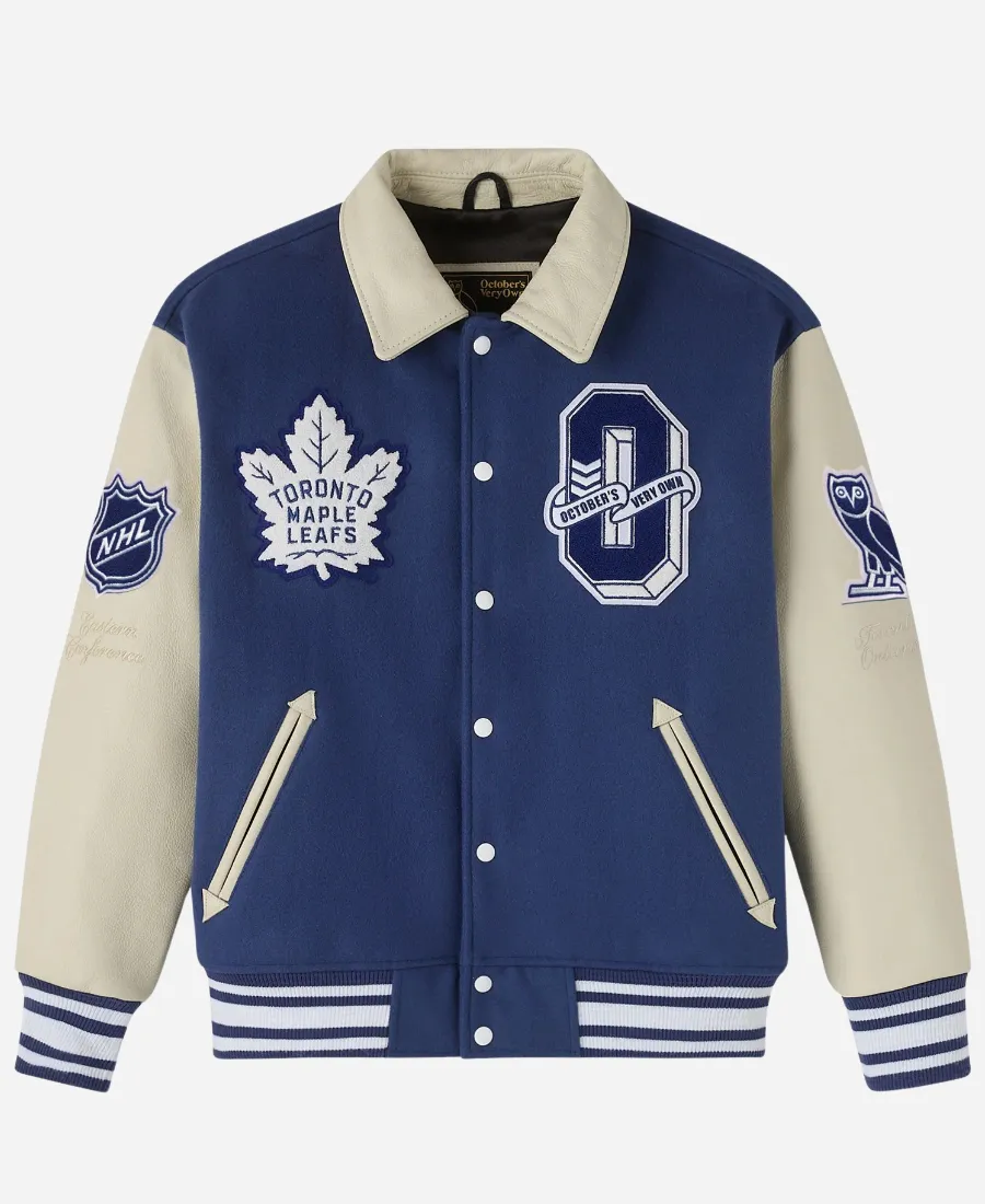 Not your ordinary varsity jacket. But this gorgeous one is a statement piece that bridges sports culture and high fashion. Yes, for you all —especially the fans of the famous NHL team, the Toronto Maple Leafs —Jacket Era is here with a classy varsity jacket. Take a slide into the captivating and famous OVO Toronto Maple Leafs Varsity Jacket and steal the show. Moreover, this trendy and appealing blue varsity jacket is a collaborative creation. It comes from the collaboration between the famous fashion brand October’s Very Own and the NHL for the Toronto Maple Leafs. This varsity jacket elegantly infuses Drake’s OVO’s premium style with Leafs pride to make it the best investment. On the other hand, it is what brings the best of both worlds into one exclusive design. Thus, grab it now and show your affection for the Buds with pride and style without trying hard.