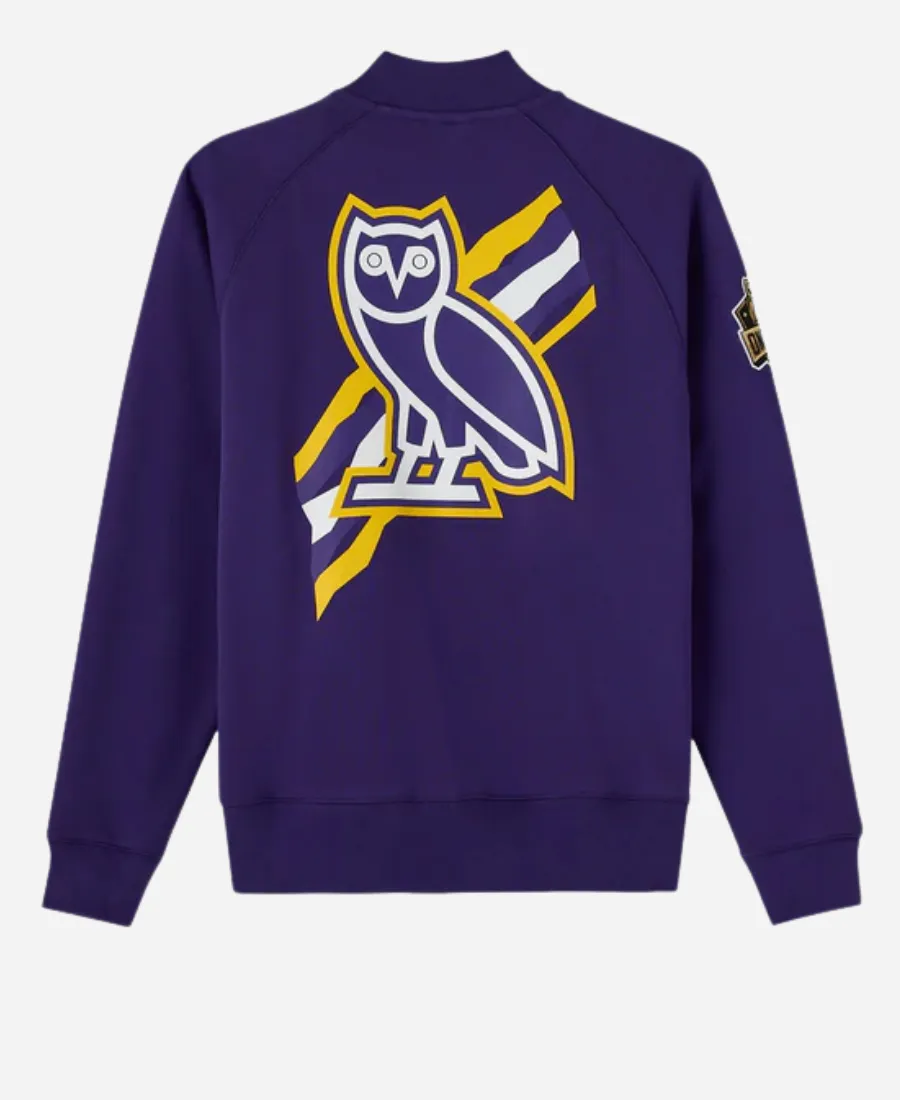 The bold fusion of LA Lakers pride and OVO style, this LA Lakers OVO Purple Jacket is now available at Jacket Era. Furthermore, this beautiful purple creation is available here in our new collection in pure fleece fabric in different sizes. It comes with long sleeves, rich ribbed cuffs, a rich ribbed collar, and a rich ribbed hem for a chic fit. The branded and durable zipper front makes this purple jacket easy to wear over anything from your closet. To provide you with the best and most comfortable experience, this jacket offers a butter-soft inner lining. However, the high-quality logos and emblems, especially OVO’s signature owl at the back, add more to its allure. It is your go-to piece for both game days and chill days. So, to turn heads, repping your favorite NBA team with style and luxury, make this jacket yours now!