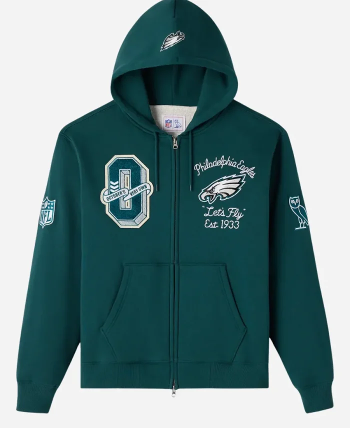 Step into the modern sports fashion world by wearing the enchanting OVO NFL Philadelphia Eagles Waffle-Lined Hoodie. To enhance your streetwear look with the Eagles’ vibe and contemporary flair, this green waffle-lined hoodie is the best pick. It is what comes from an iconic and famous 2025 collaboration between October’s Very Own (OVO) and the NFL. Furthermore, for a true fan of the NFL’s famous Philadelphia Eagles, this classy and comfy green hoodie is an ideal investment. It is not an ordinary green piece of clothing. But it’s what blends American football culture with cutting-edge OVO aesthetics to make it the perfect buy. On the other hand, this gorgeous waffle-lined green hoodie is now available at Jacket Era as a flawless imitation. So, make it yours and add it now to your collection to steal the spotlight, showcasing your affection for the Philadelphia Eagles.