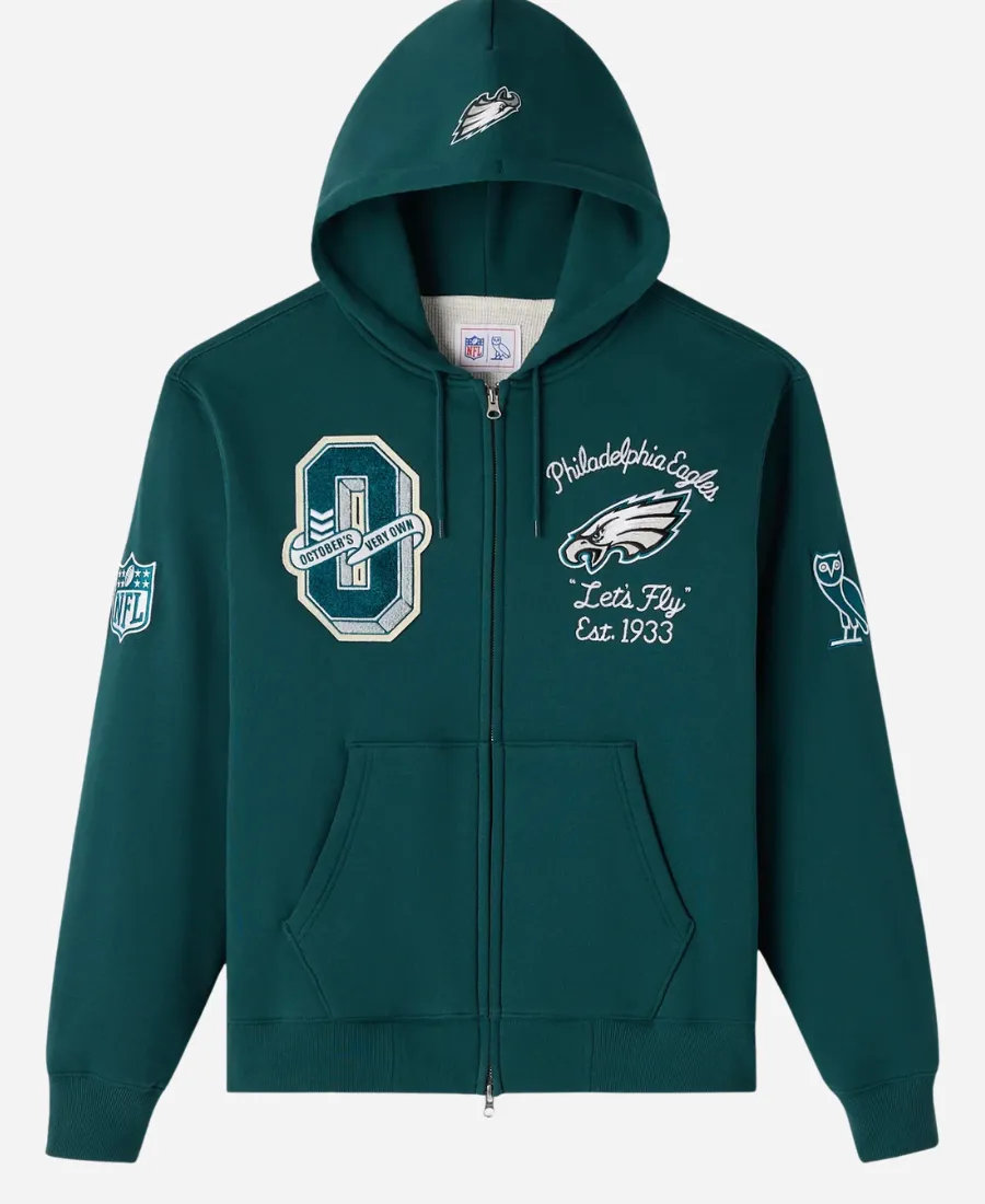 Not every hoodie can provide you with both modern style and premium comfort. This 2025 OVO Eagles Hoodie is the one that gives you both. Moreover, this tempting green piece is now here in our latest collection in top-notch fleece. Our skillful craftsman tailors this waffle-lined green hoodie with high-quality stitching in different sizes, especially for the fans. It comes with a butter-soft inner lining for endless comfort and long sleeves for a complete look. It offers a zipper front to make it easy to wear and an adjustable, thick hooded collar for some extra comfort. However, the ribbed cuffs and hem of this hoodie give you a chic fit with a clean look. In addition to its charming appearance, it features striking chenille, embroidery, and graphic prints. Thus, try this now with your favorite outfit to let your outlook speak volumes, effortlessly.