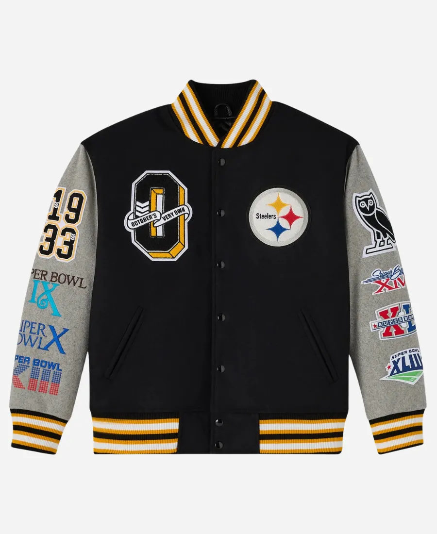 When American football culture meets high-end fashion, we get outstanding results. This fascinating OVO Pittsburgh Steelers Varsity Jacket is an excellent example. Moreover, for the fans of the Steelers, the Jacket Era is here with this exquisite black masterpiece. It is not an ordinary black varsity jacket. But it’s what makes you look trendy and stand out among all. This classy black beauty comes from the popular Canadian fashion brand, October’s Very Own (OVO), for the NFL’s Steelers. It is a part of the 2025 collection of the collab between the NFL and the OVO. On the other hand, this gorgeous black varsity jacket is available at Jacket Era as a flawless imitation. To make yourself prominent everywhere without trying hard, this varsity is what you must have. Thus, pair it now to show off your affection fashionably for your favorite NFL team, the Pittsburgh Steelers.