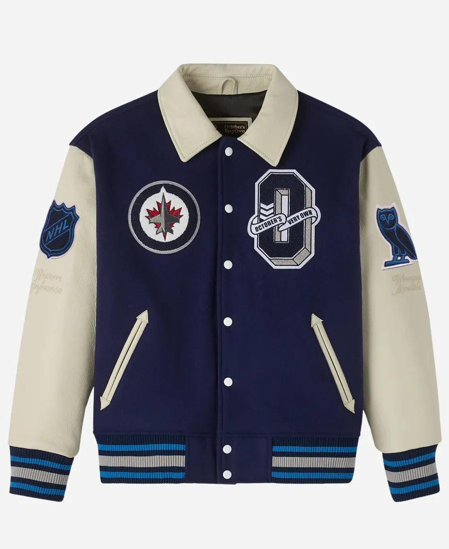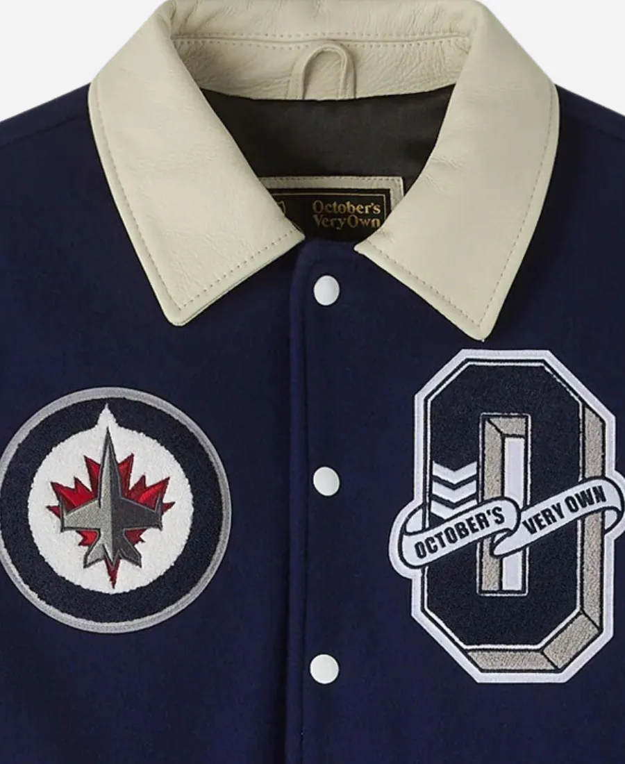 When you blend the iconic OVO aesthetic with the energy of the Winnipeg Jets, you get the ultimate fan jacket. Introducing you to the captivating OVO Jets Jacket, a premium mix of sports and high-end street fashion. To fly high, showcasing your love fashionably for the NHL team, the Winnipeg Jets, this navy blue varsity jacket is a must-have. Furthermore, this cute creation comes from the collaboration between Drake’s fashion brand October’s Very Own and the NHL for the Winnipeg Jets. On the other hand, this intriguing varsity jacket is available here at Jacket Era as a flawless imitation. It is more than just a jacket, but it’s a symbol of team pride and luxury. Thus, to step up your sports fashion game with modern charm, take a slide into this gorgeous navy blue masterpiece.