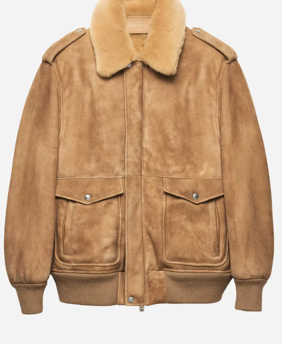 Prada Suede And Shearling Collar Patch Pocket Bomber Jacket