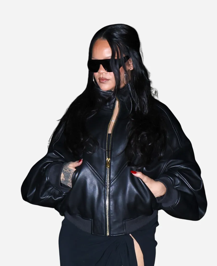 2026 Actor Awards Rihanna LA Date Night Black Leather Bomber Jacket