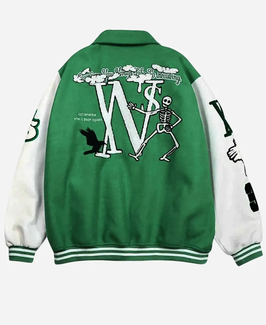 Skeleton Flocking Hip Hop Varsity Green Jacket