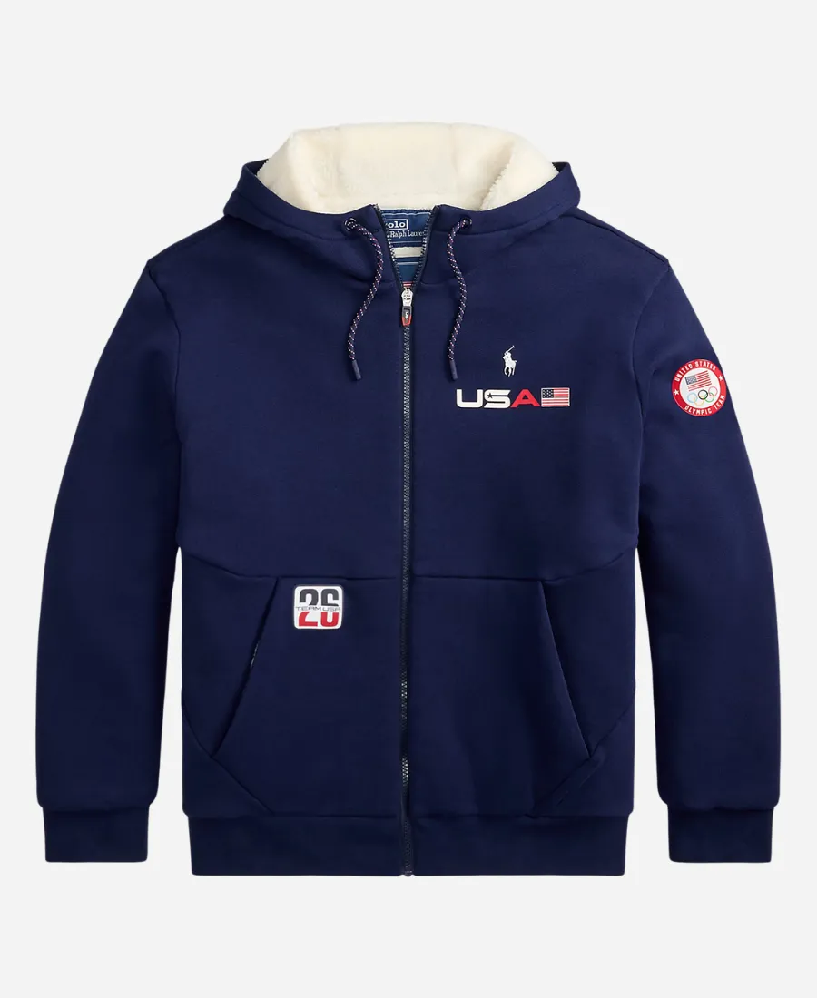 Looking for something trendy to look great while representing the red, white, and blue this 2026 Olympic season? Ready to keep yourself warm and stylish while supporting Team USA? Take a slide into the captivating Ralph Lauren Team USA Olympic 2026 Fleece Full-Zip Hoodie. A perfect mix of comfort, style, and American pride—this navy-blue hoodie is the best addition for a true fan. Moreover, it comes from our favorite fashion brand, Ralph Lauren’s famous collection for the 2026 Olympic Team USA. On the other hand, this trendy navy-blue hoodie is now available at Jacket Era as a flawless imitation. Whether you’re at home or cheering on Team USA, this classy masterpiece offers the ultimate in warmth and Olympic spirit. Thus, give it a try and stylishly stand among those who want to wear their pride every day!