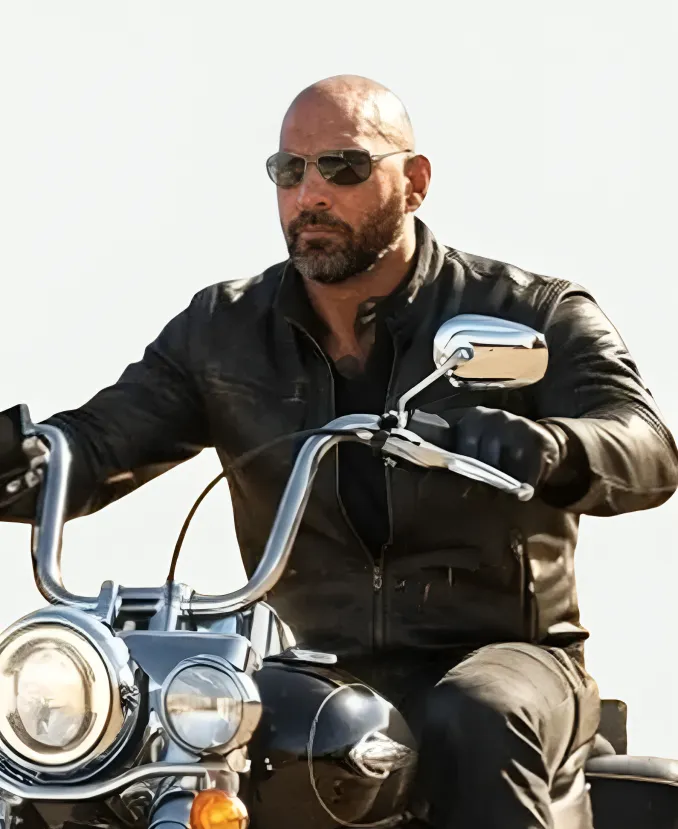 Dave Bautista Movie The Wrecking Crew 2026 James Black Leather Jacket