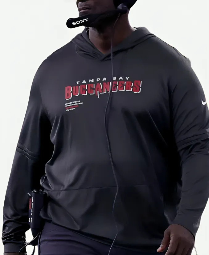 The Buccaneers Todd Bowles Sideline 2025 Black Hoodie T-Shirt is now available at Jacket Era. Moreover, it is available here as an imitation in pure fleece fabric in different sizes, especially for the Bowles fans. This elegant black tee is an ideal blend of timeless comfort and bold Buccaneers attitude. It comes with long sleeves, a pullover front, and a cozy hooded collar that adds more to its style. However, modeling this sleek black hoodie tee will make you turn heads while rep’ing your favorite team. The Tampa Bay Buccaneers’ fonts and the NFL and Nike logos add more appeal to its aesthetics. It is lightweight, breathable, and perfect for training or casual wear. So, pair it now to keep your Buccaneers pride front and center.