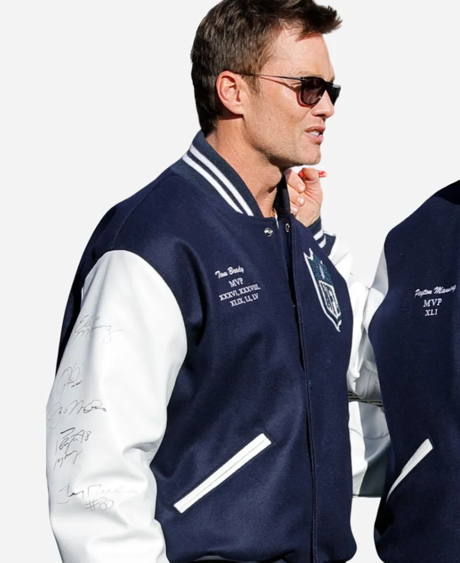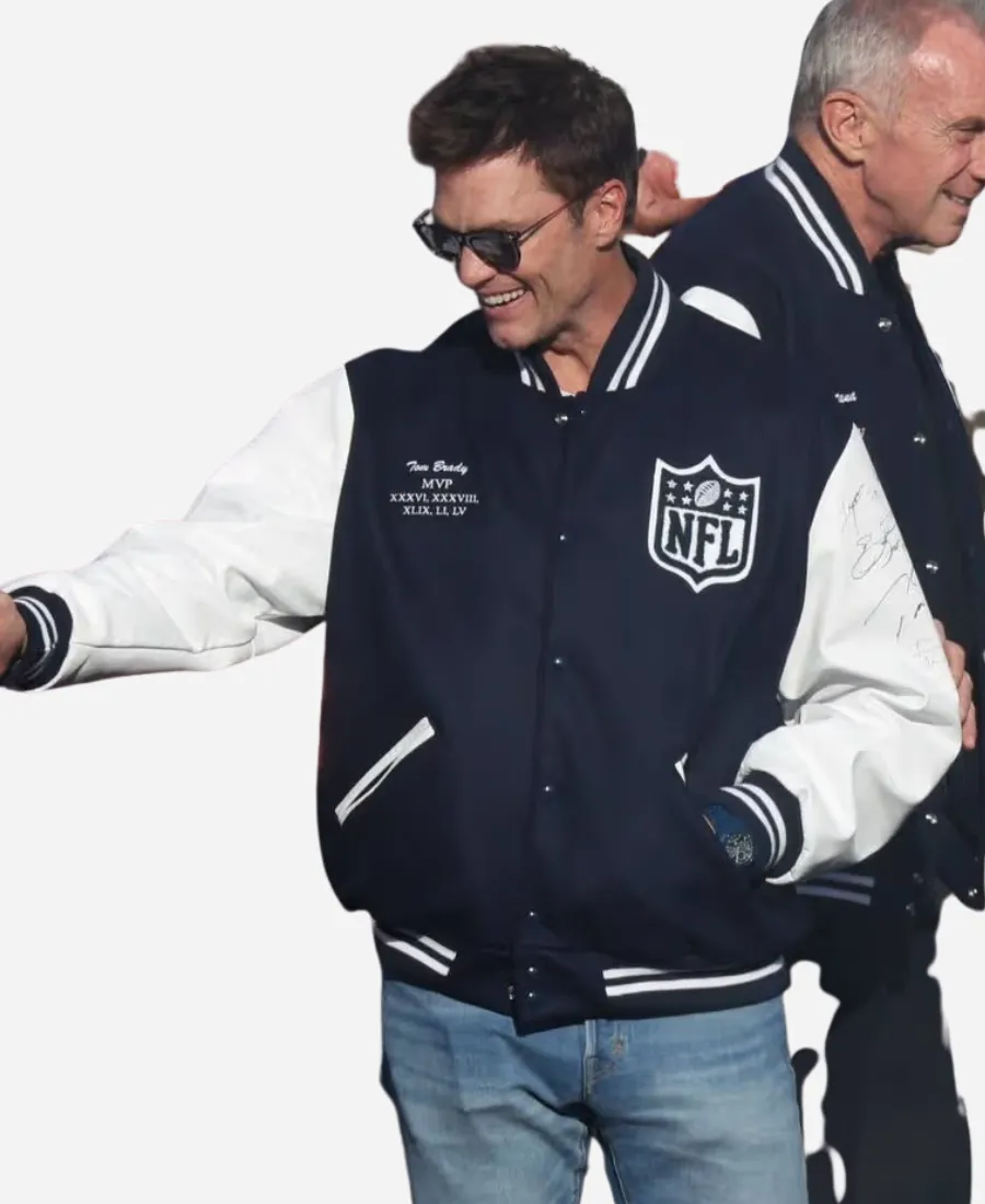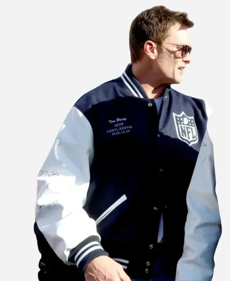 Not only for the fans. But this alluring blue and white varsity jacket is also the best pick for those who want to wear a sports fashion trend. Introducing you to the gorgeous Tom Brady Super Bowl LX MVP Jacket, where timeless elegance meets top-notch craftsmanship. Moreover, this exquisite varsity jacket is not an ordinary jacket. But it is what combines premium comfort with style and the energy of the Super Bowl LX in one standout masterpiece. On the other hand, it comes from the closet of the handsome American former professional football quarterback, Tom Brady. He wears this sassy blue and white varsity jacket while appearing on the famous American football game, Super Bowl LX. Wearing this varsity jacket, Tom Brady shows his true love for the NFL, making a powerful style statement. So, give it a try and be the showstopper just like your favorite QB, Tom Brady!