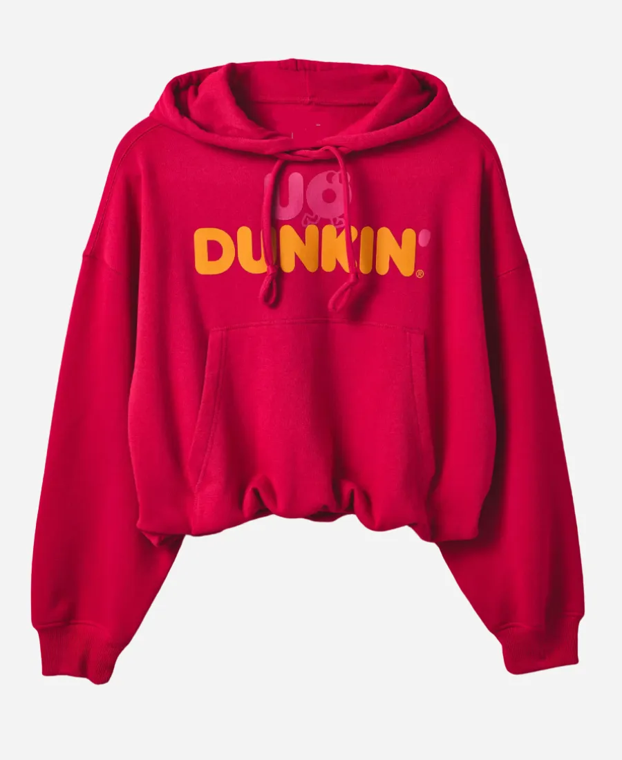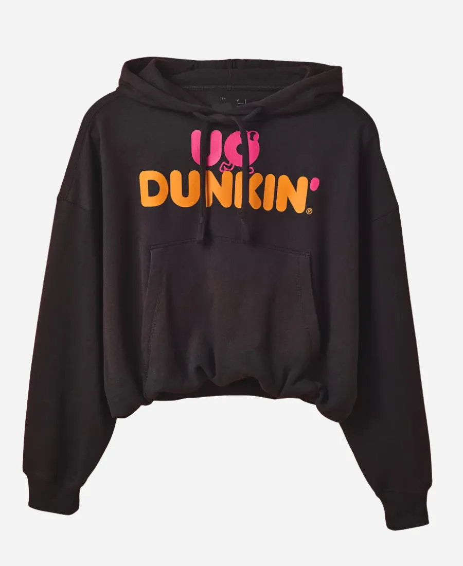 If Dunkin’ runs in your veins and style is your language, then the hoodie that we bring is the best for you. Take a slide into the famous UO x Dunkin Graphic Bubble Hoodie. A perfect fusion of comfort, color, and cultural cool. Furthermore, this gorgeous black creation is a result of the collaboration between the multinational lifestyle and fashion brand Urban Outfitters (UO) and our favorite coffee stop, Dunkin. It is a cute black creation that helps you make a statement without saying a word. On the other hand, it blends caffeine culture with a street-style aesthetic that’s impossible to ignore. If you want to look prominent and different from the crowd, this is exactly what you need. So, grab it now to gracefully celebrate self-expression with a delicious twist!